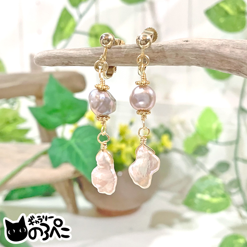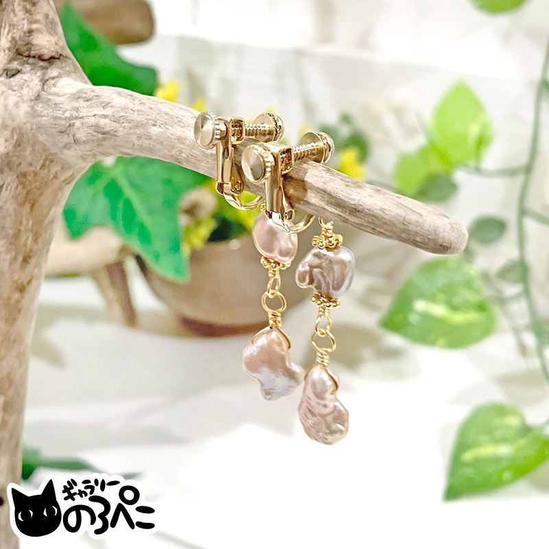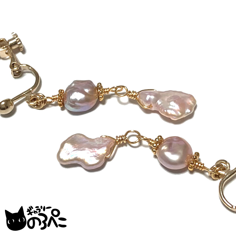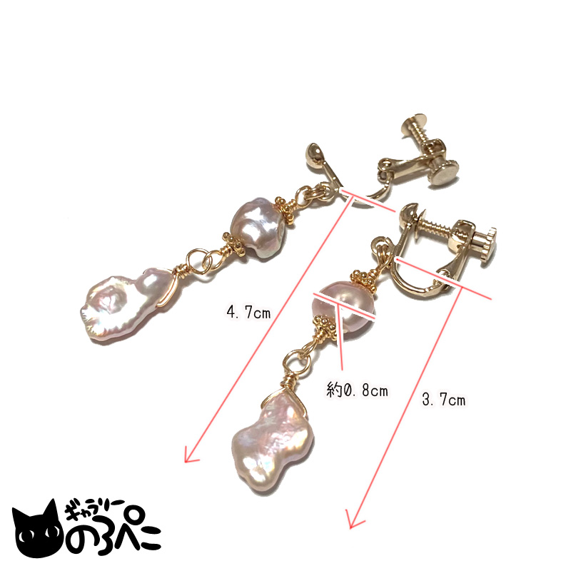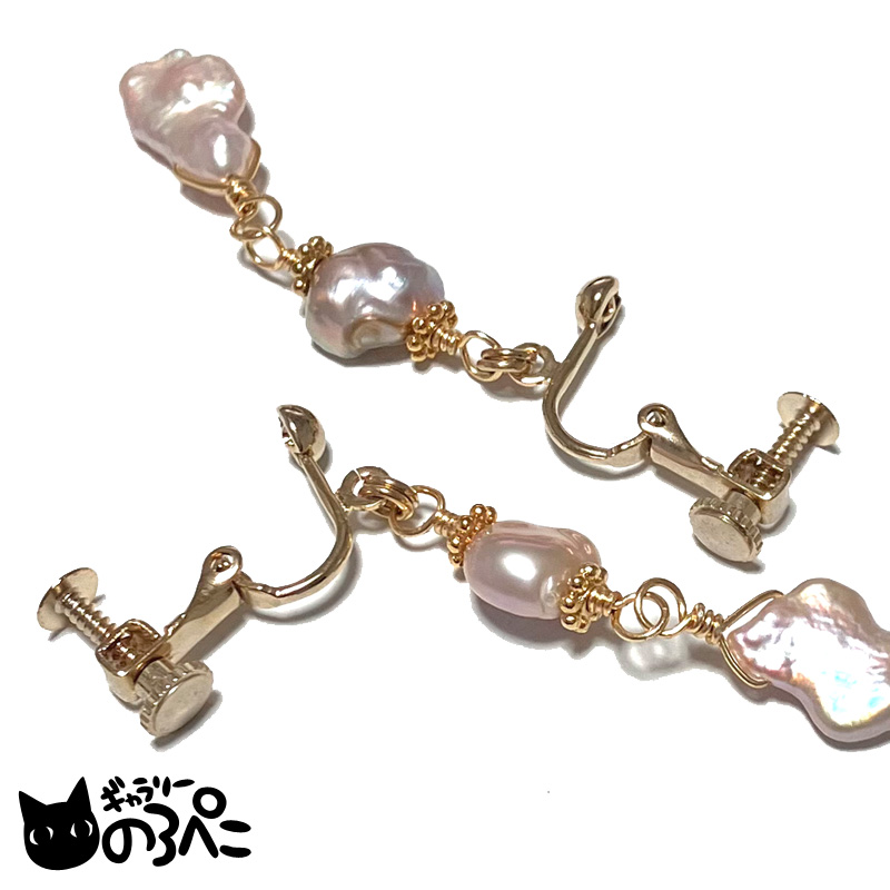淡水芥子パール、メタルビーズ、ワイヤー、ネジバネ式イヤリング金具