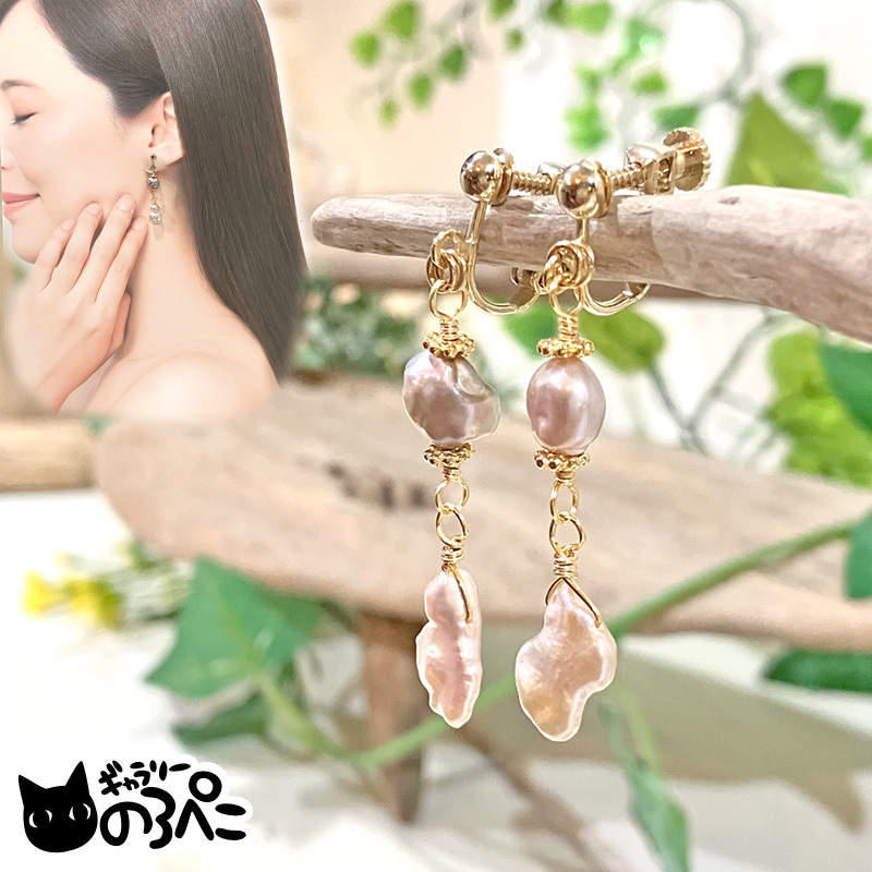 まるみのある芥子パールの下にリーフ状の芥子パールをあわせたデザインは、エレガントな品の中に華やかさと可愛らしさがきらめきます。どの粒もでこぼこしているので、揺れると、ピンク色を帯びたつややかな照りの中に、微かなグリーンやブルーの色の変化が豊かにあらわれとても綺麗です。