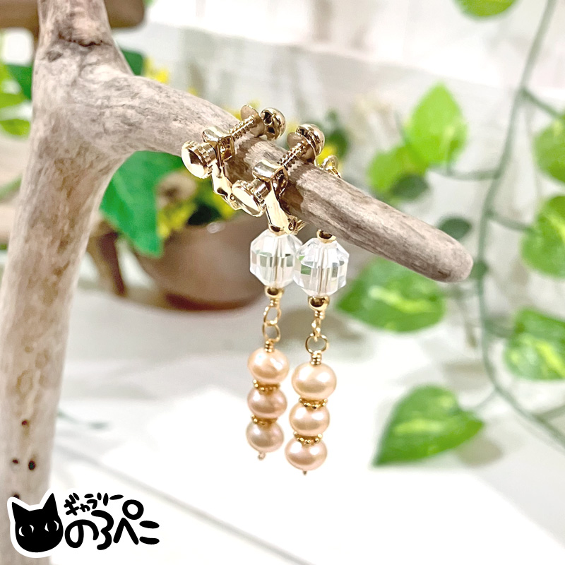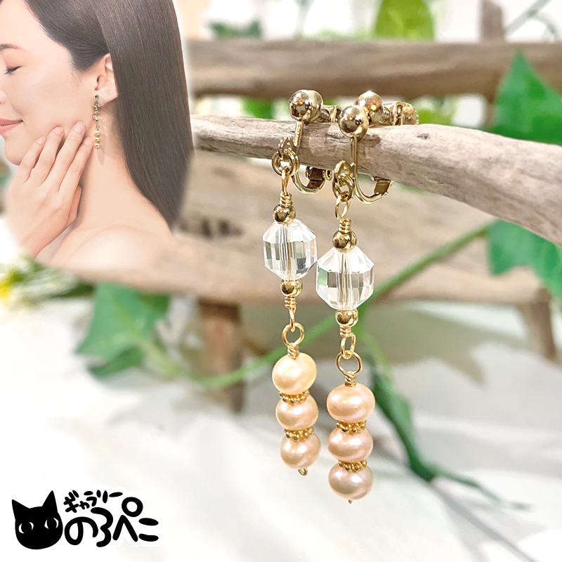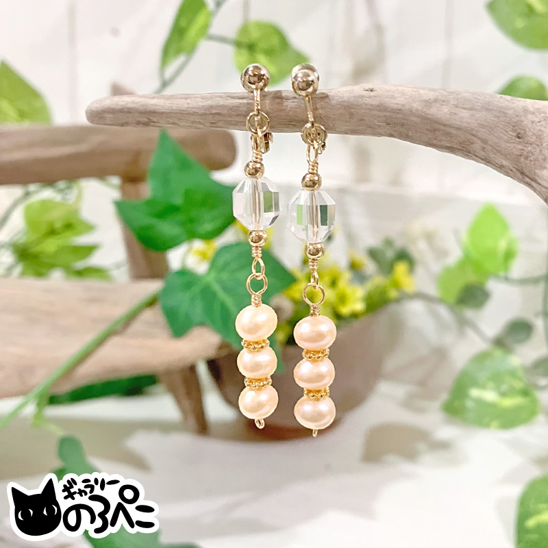 水晶と三連淡水パールのイヤリング(澄んだ輝きの水晶とあたたかみあるオレンジの淡水パールの天然石イヤリング)
