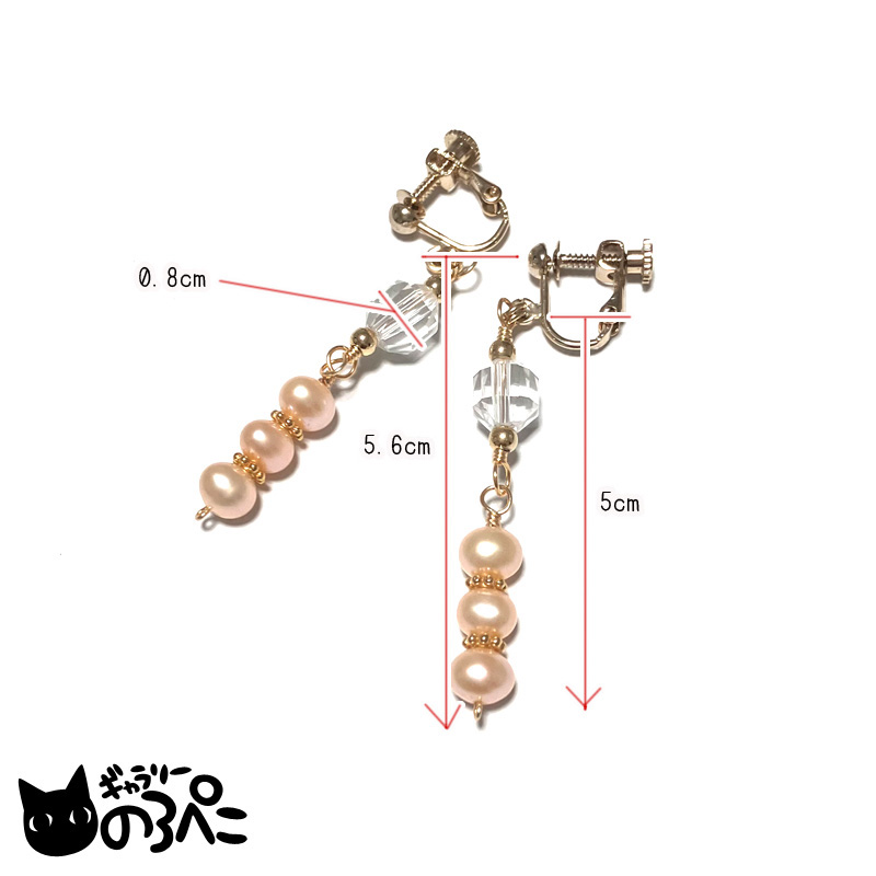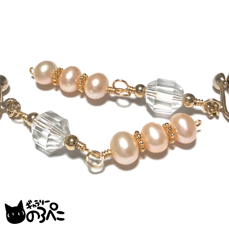 天然石(水晶)、淡水パール、メタルビーズ、ワイヤー、ネジバネ式イヤリング金具