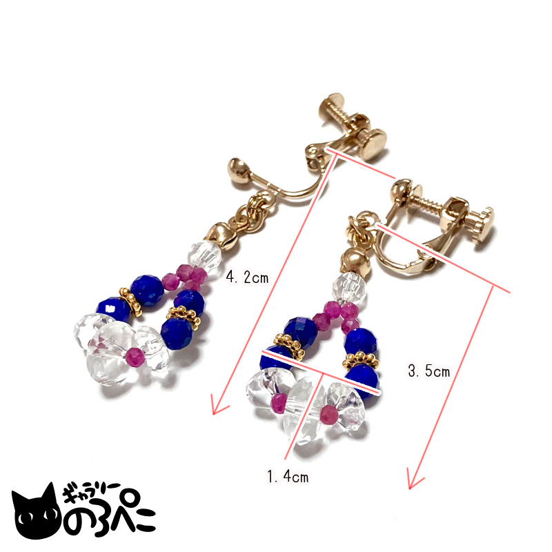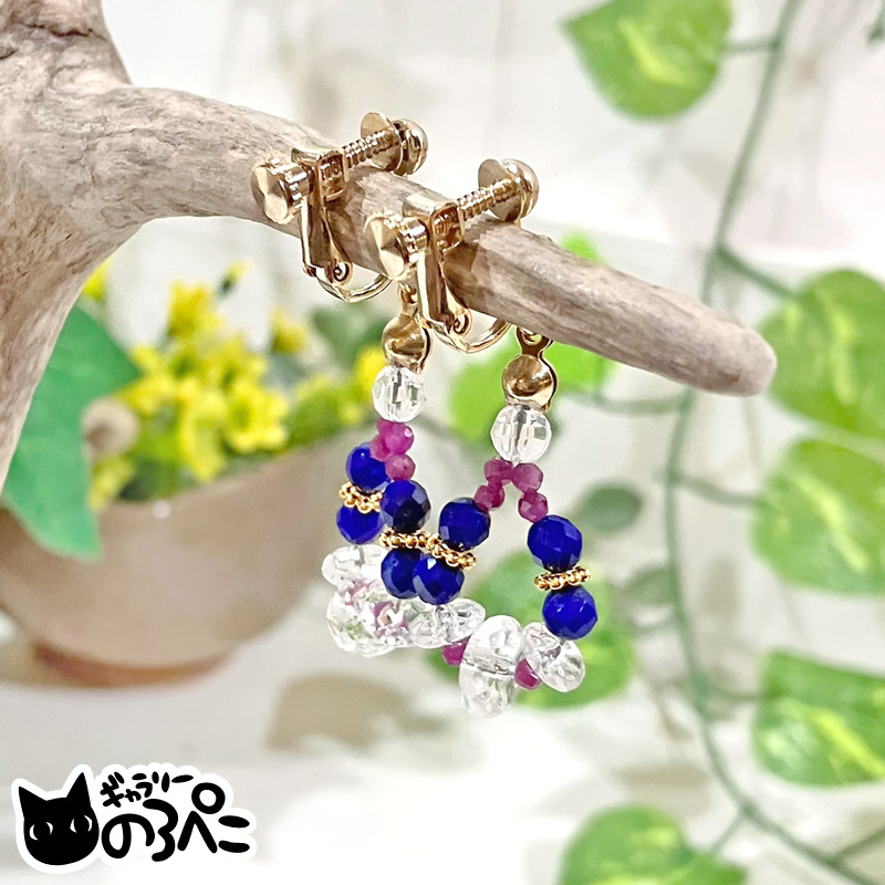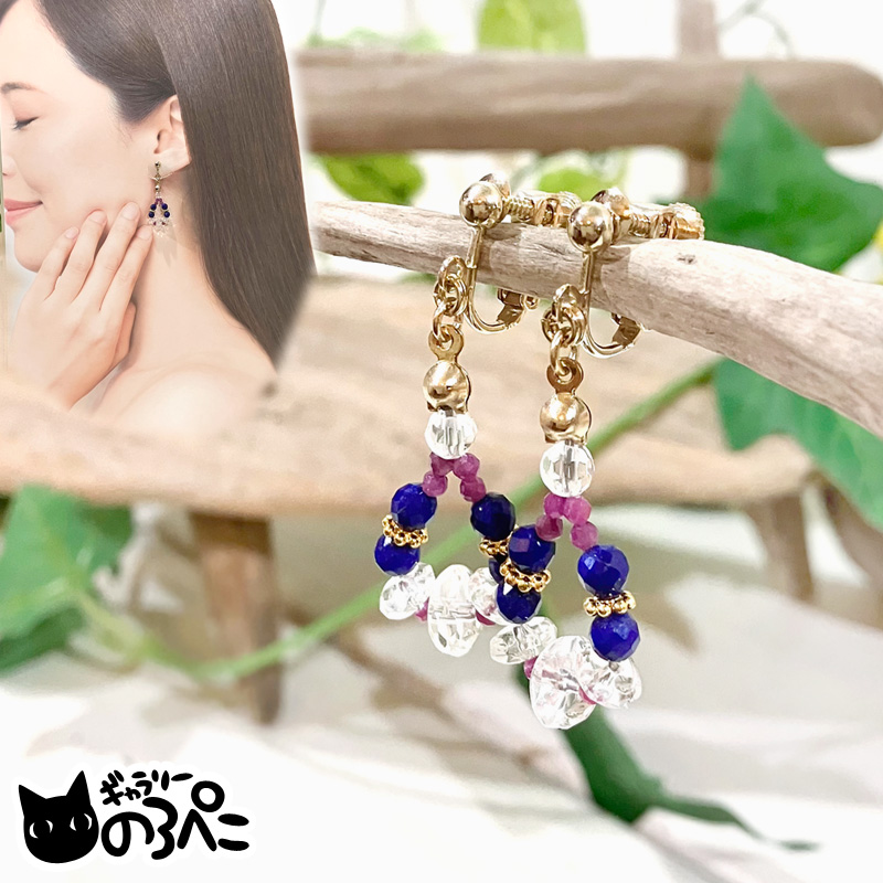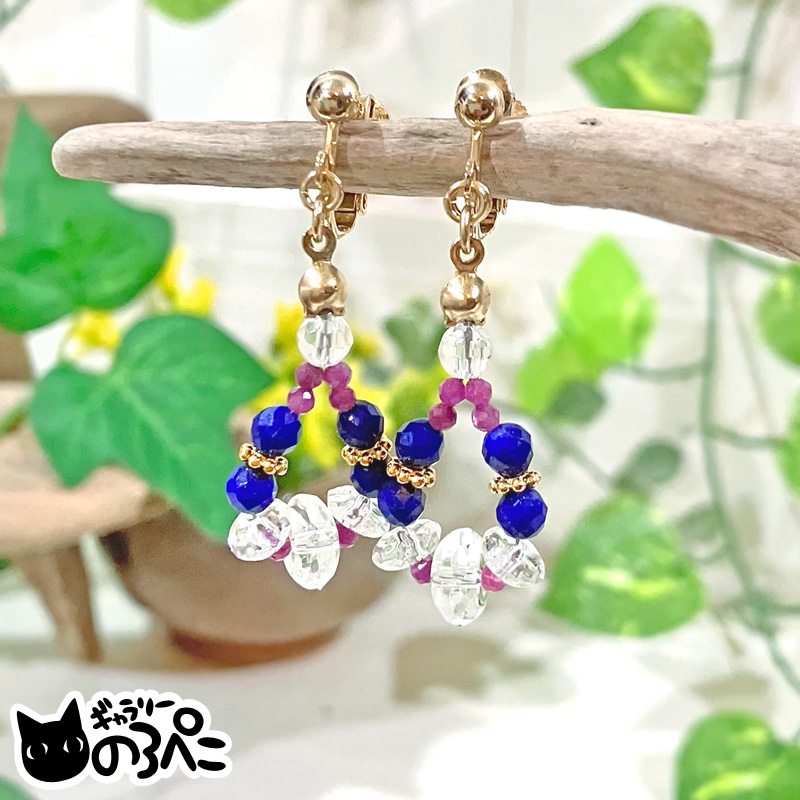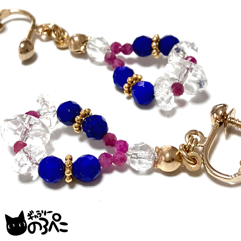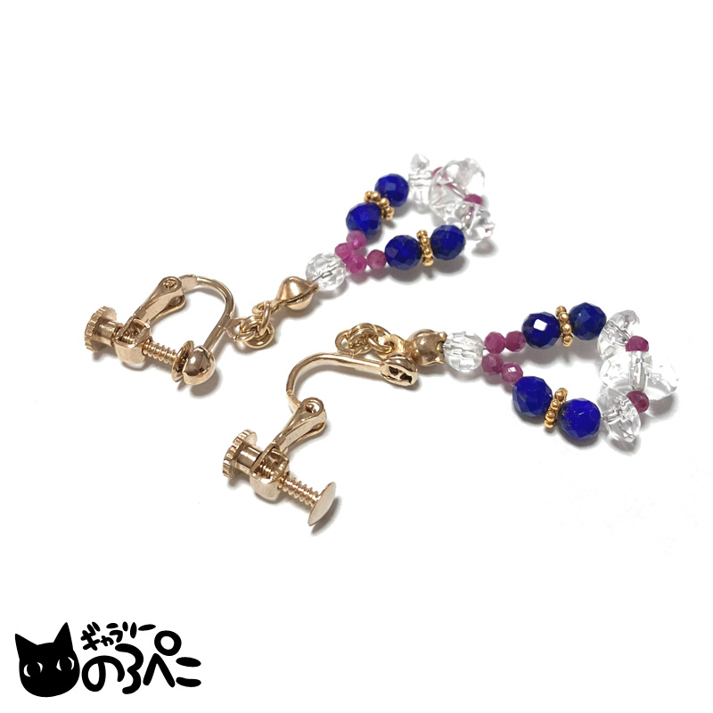 天然石(水晶・ラピスラズリ・ルビー)、ワイヤー、ネジバネ式イヤリング金具