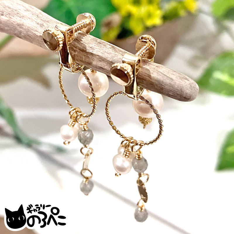 ツイストフープに淡水パールとゴールドの輝きが浮かぶラブラドライトをフリンジにつないだチャームは、気分を変えたい時や少し華やかさが欲しい時に。