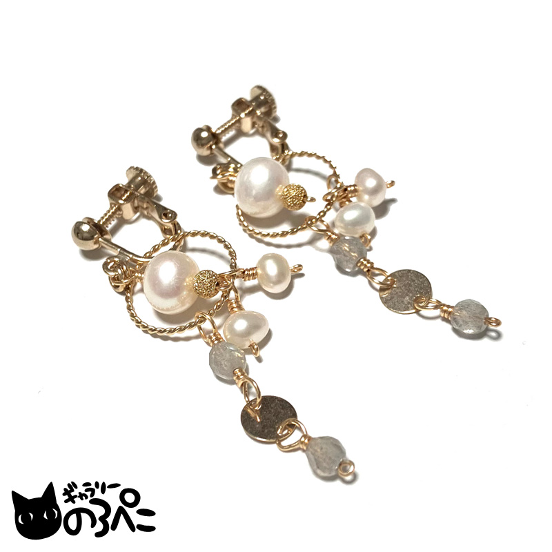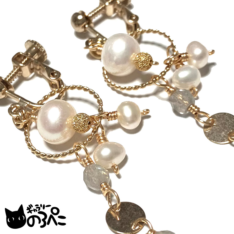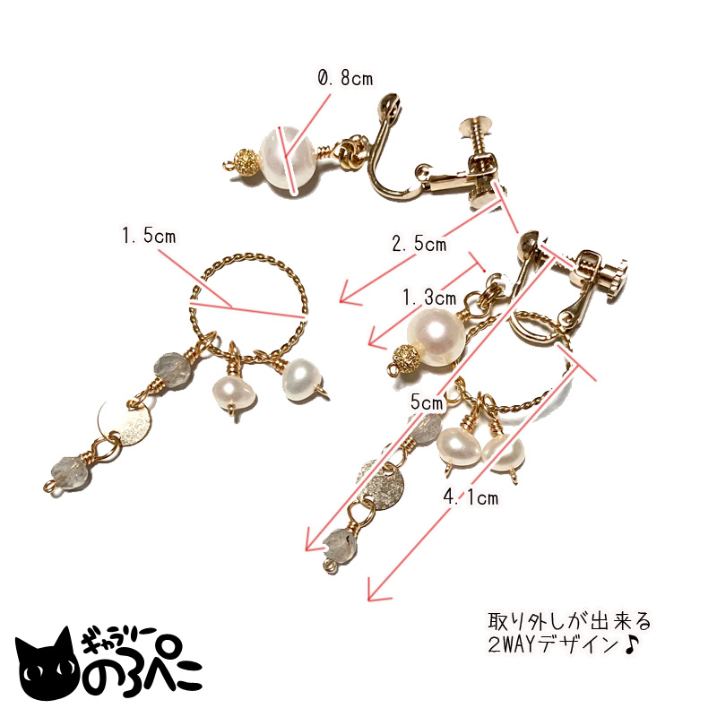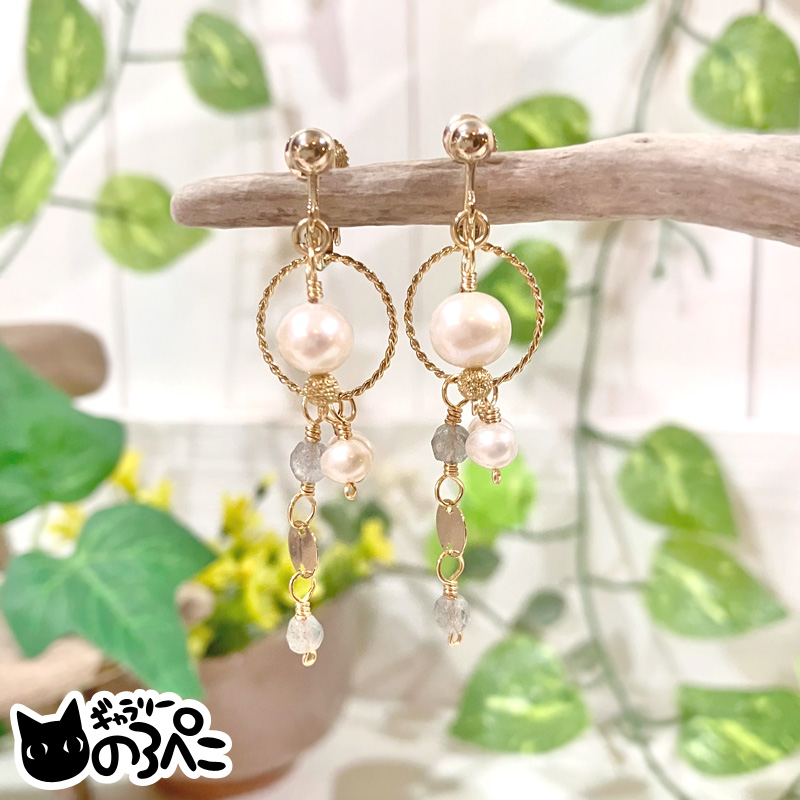 淡水パールは約8mm。フリンジにあわせたラブラドライトや淡水パールは小さな粒なので、長さがありますがすっきりと洗練されたデザインです。