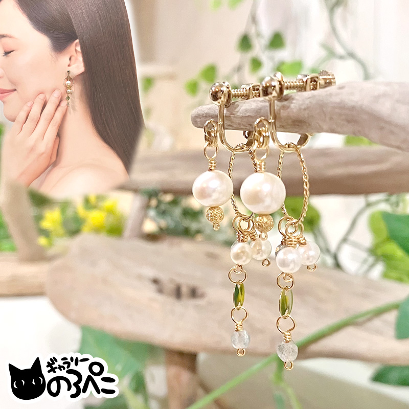 フリンジをつけたときは、ぷっくりとした淡水パールがツイストフープの中で揺れるような感じに。