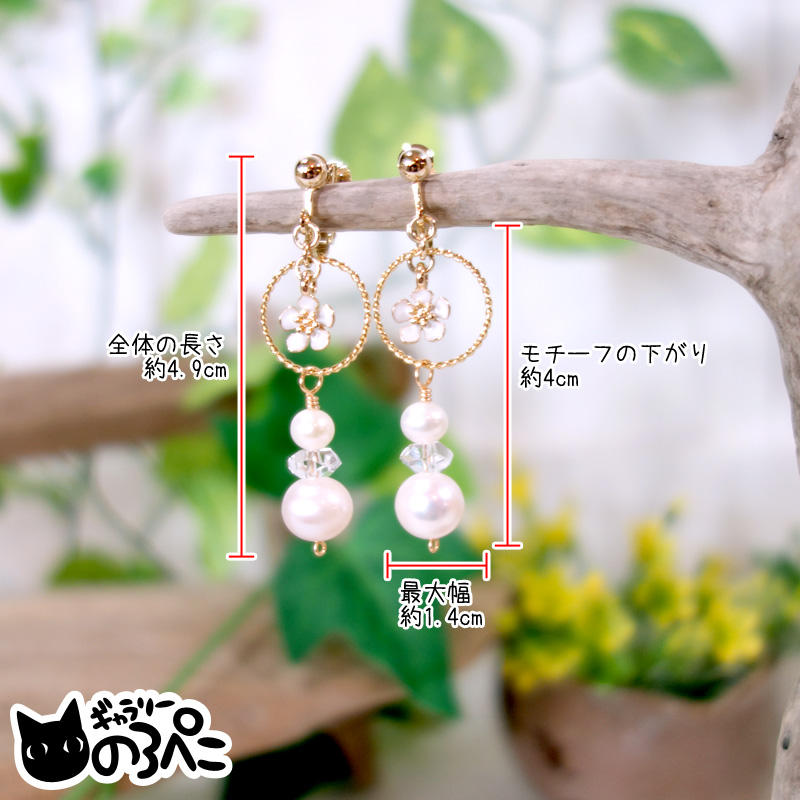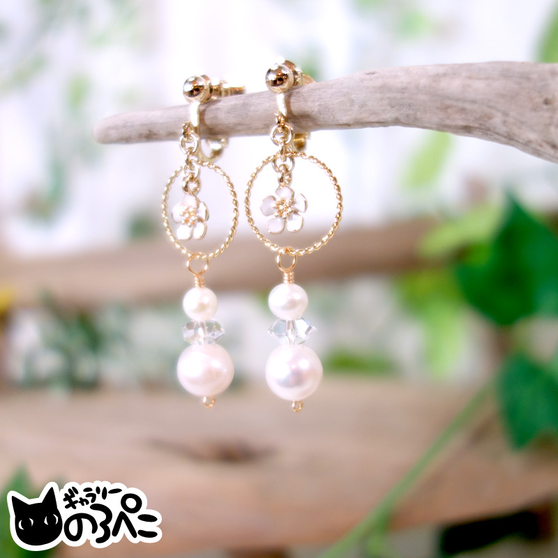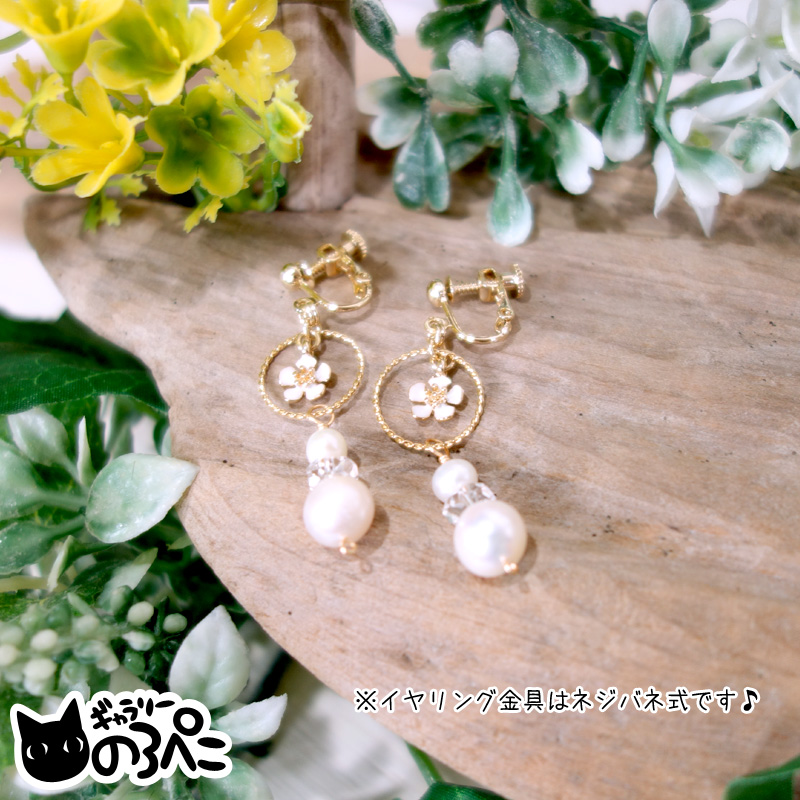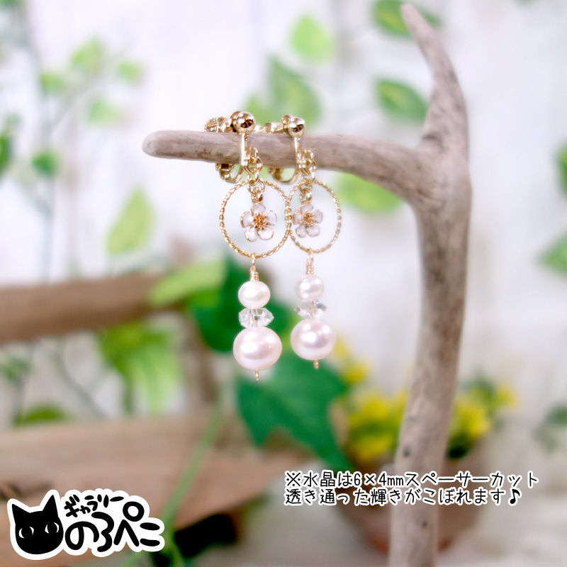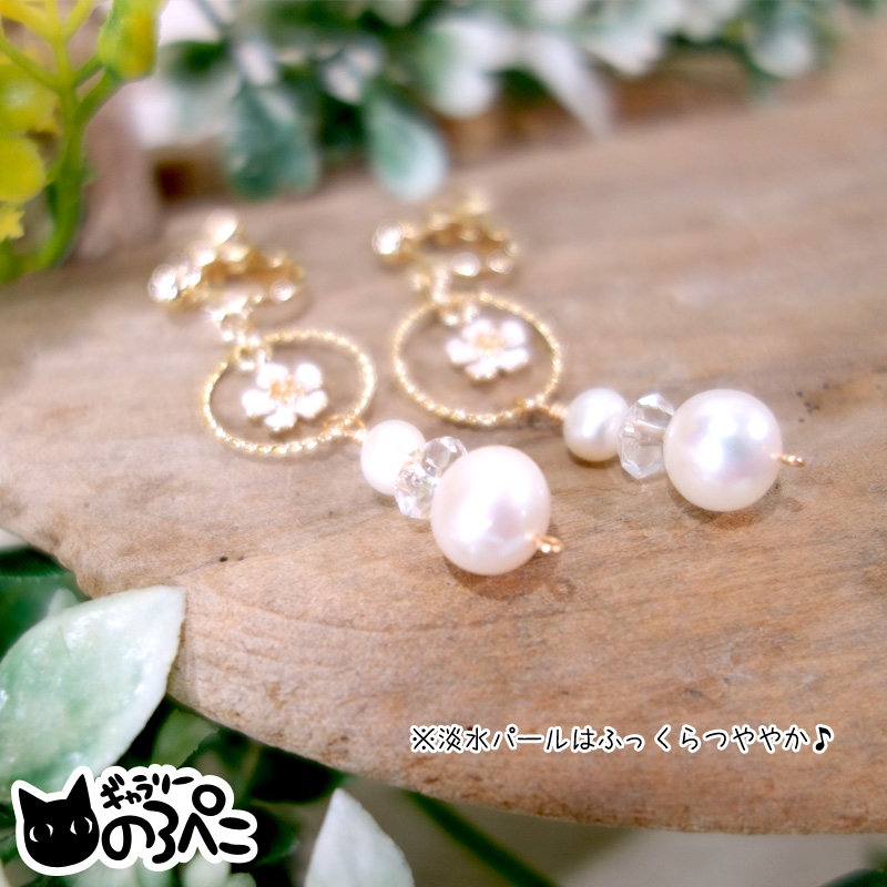 水晶がきらめく淡水パールと忘れな草のイヤリング(フープの中で白い忘れな草の花が揺れる天然石イヤリング)