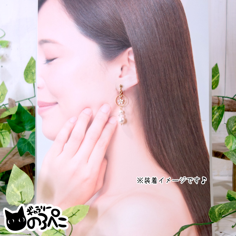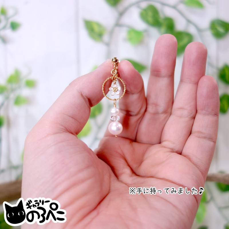 淡水パールのモチーフは、アーティスティックワイヤーを使い、丁寧なめがね留めでツイストフープに繋いであります。細かに揺れる忘れな草の下で淡水パールモチーフがゆったり大きく揺れるので、忘れな草の可憐さがより印象的です♪