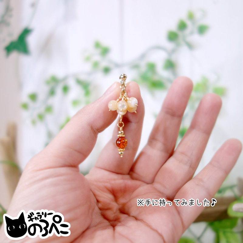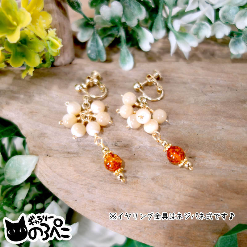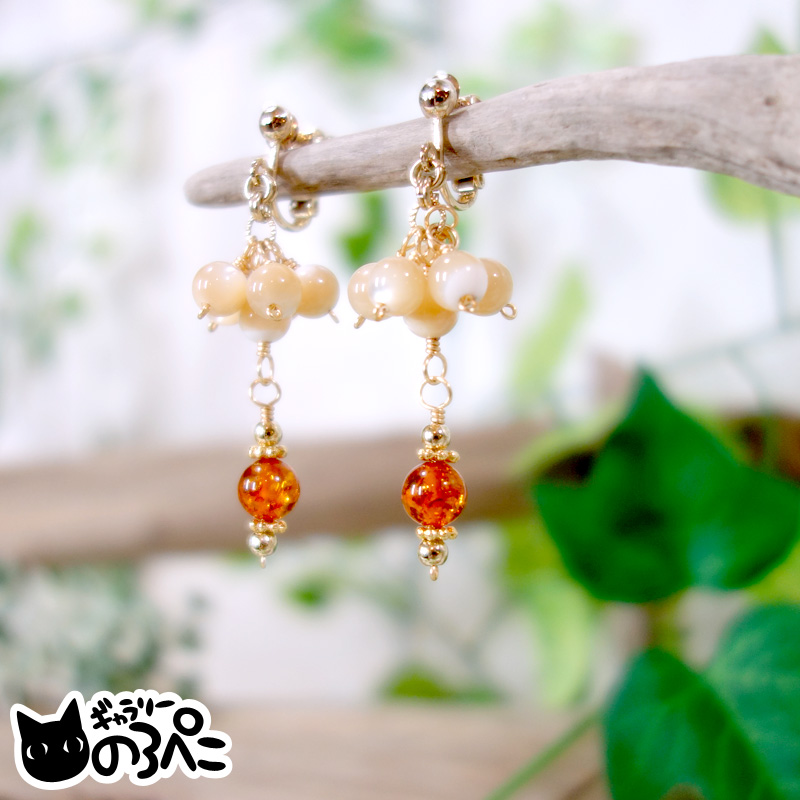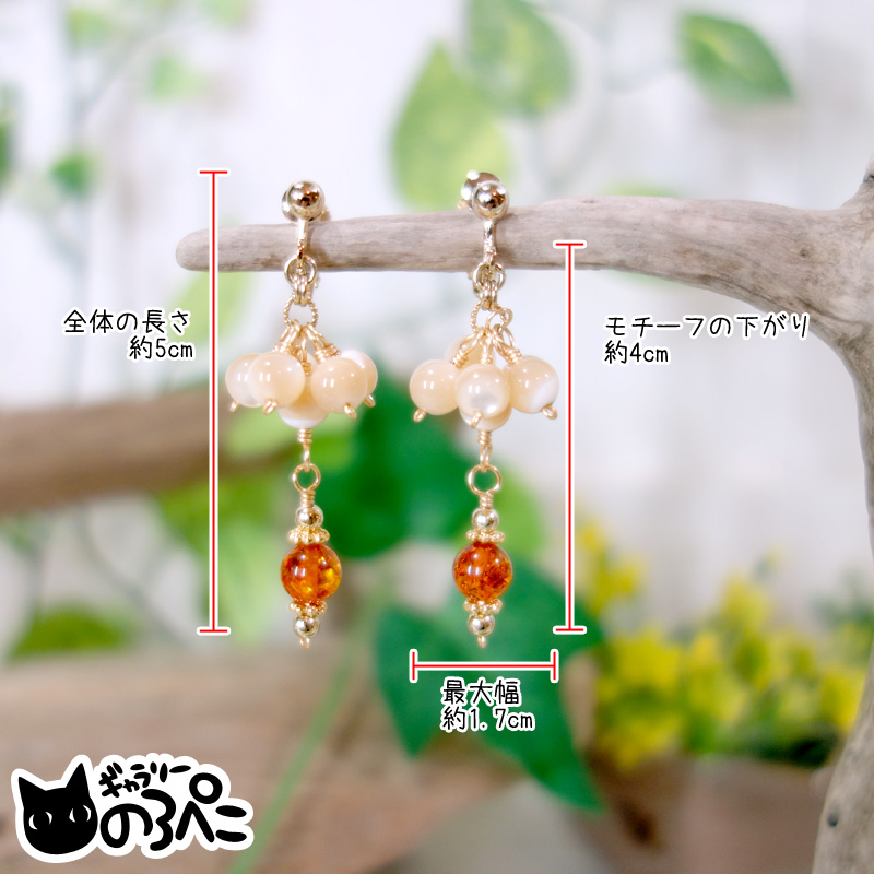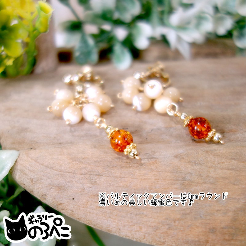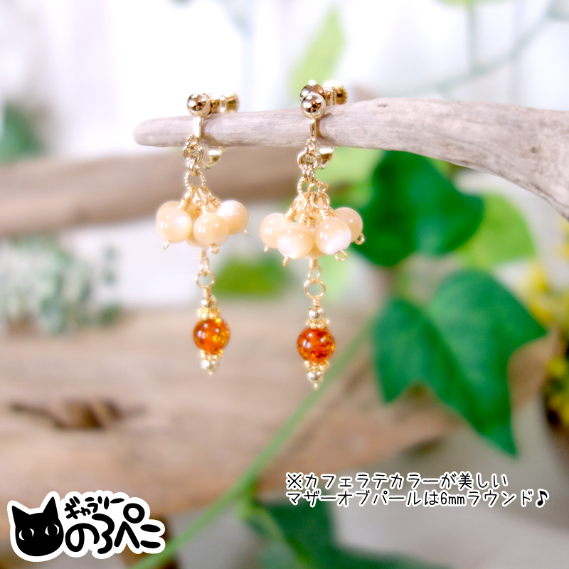 カフェラテ色のマザーオブパールのフリンジの下で蜂蜜色のバルティックアンバーが可愛く揺れるデザインです。