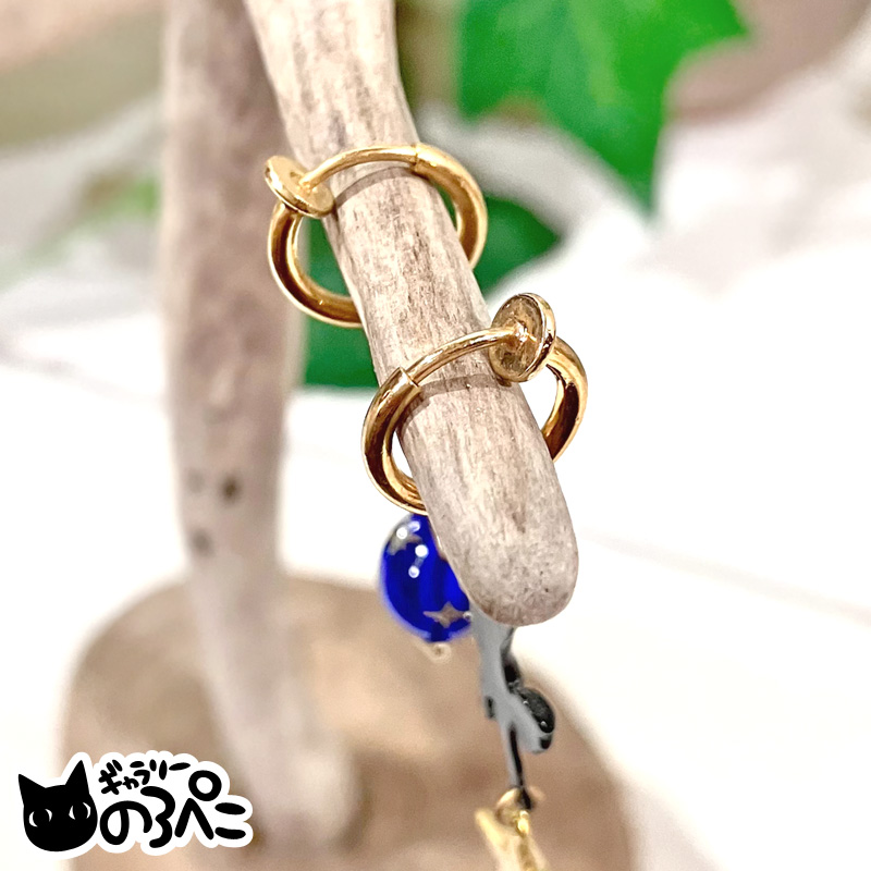 蒼い星空と黒猫のフープイヤリング(星を捕まえた黒猫ちゃんと月星夜のアシンメトリーフープイヤリング)