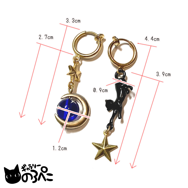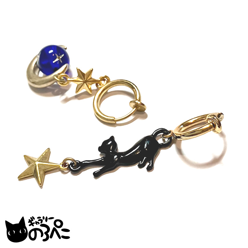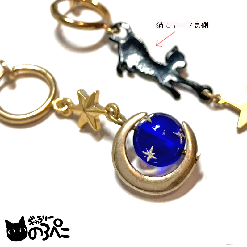 夜空から落ちた星を捕まえて遊んでいるような黒猫ちゃん。蒼い空の月と星を繋いだピアスと合わせてアシンメトリーに。