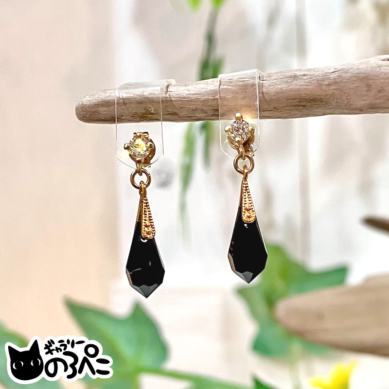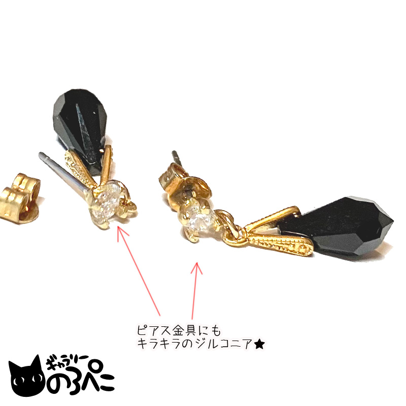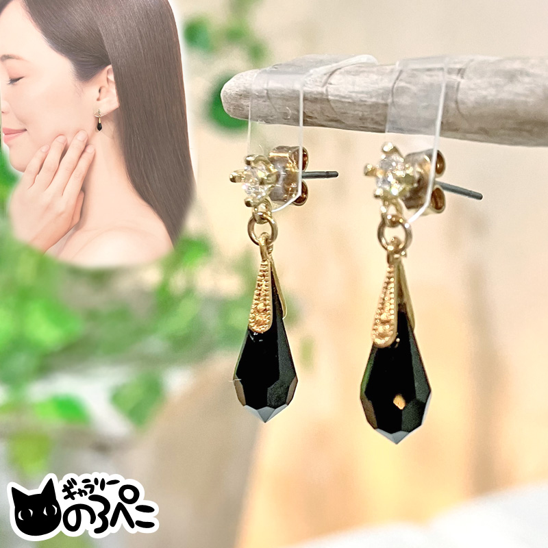 漆黒のスワロフスキーの雫が揺れるモノトーンながらに華やかなピアス。ピアス金具にはクリアカラーのジルコニアが光ります。
