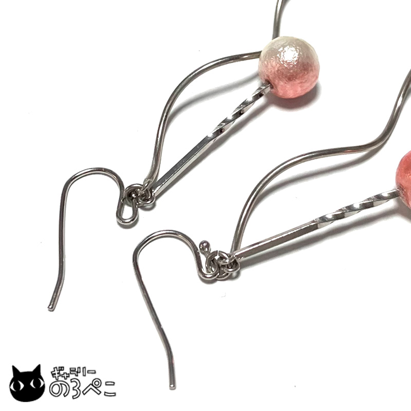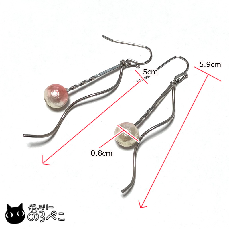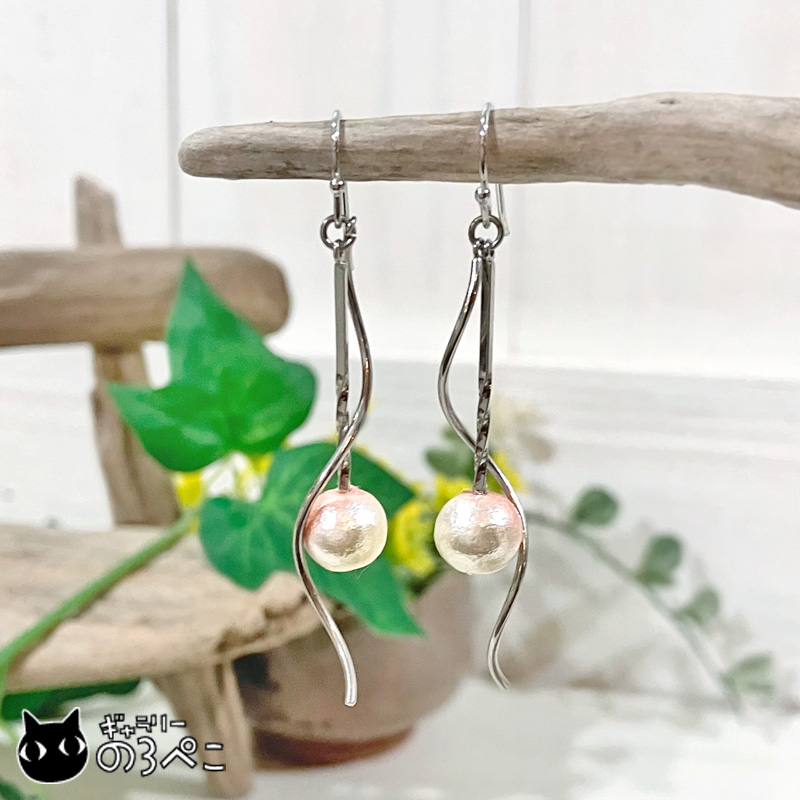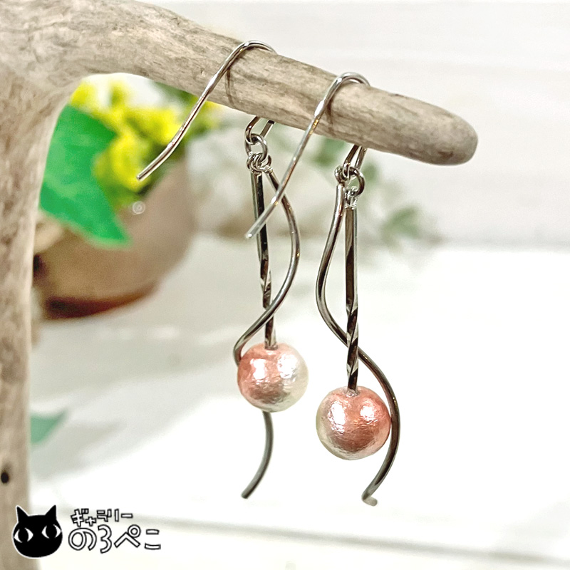 コットンパールとウェーブのピアス(ピンクバイカラーコットンパールと螺旋が揺れるピアス)