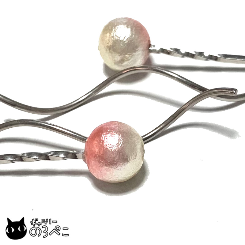 コットンパールはホワイトとやさしいピンク系の色合いのバイカラー。少し小ぶりな8mmのものをあわせてあります。