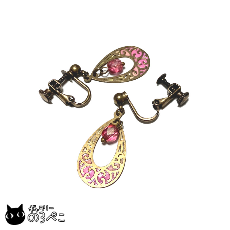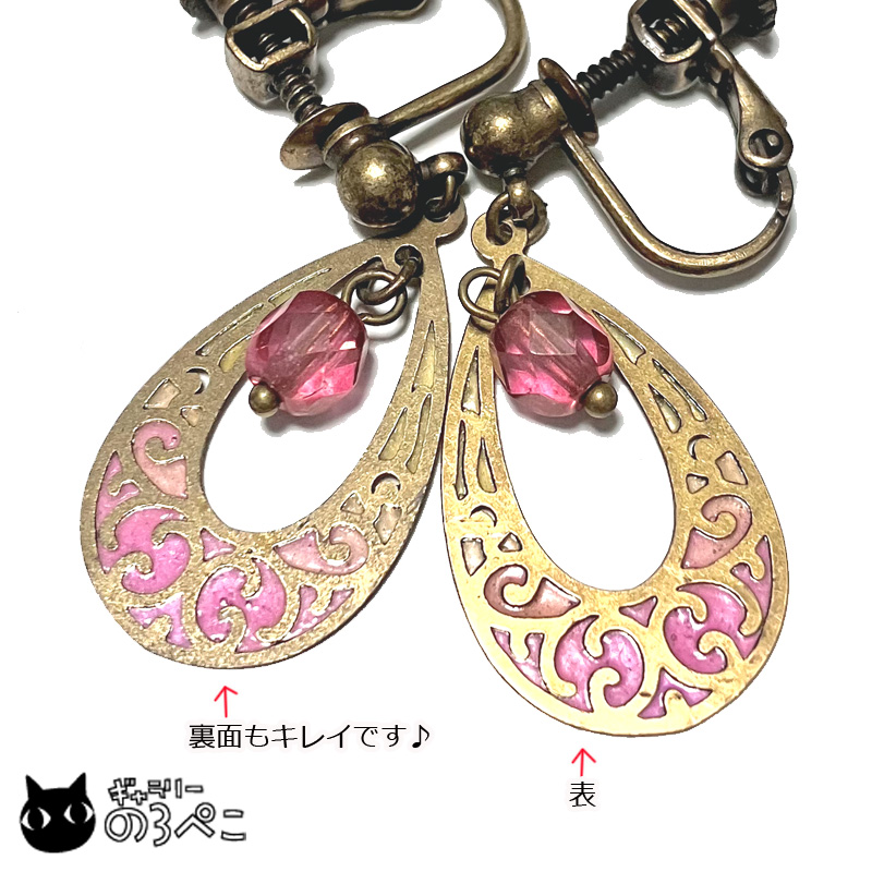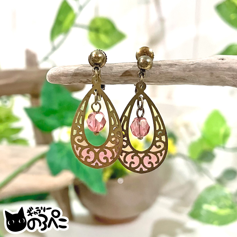 チェコビーズとステンドグラスみたいな透かしのイヤリング(オリエンタルなアンティーク風イヤリング・パープルピンク)