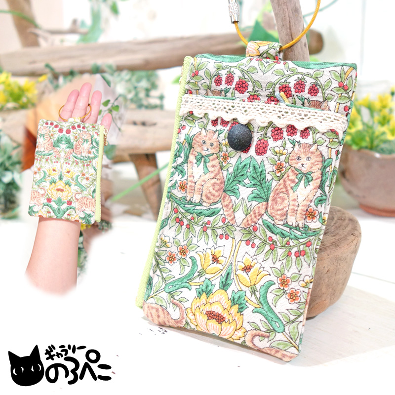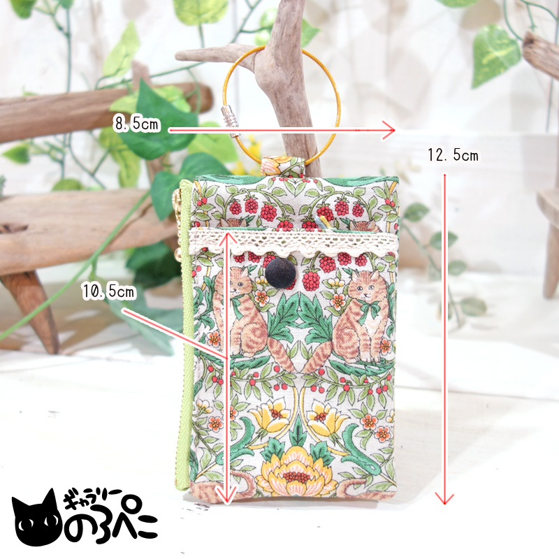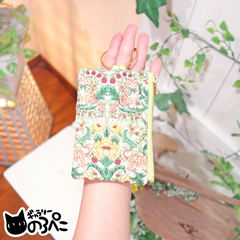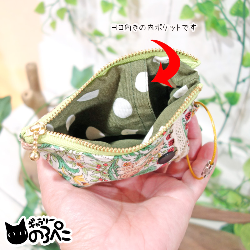 外側は美しい庭で花を見つめる猫ちゃんのコットンリネン生地。自然な風合いのベージュ色の生地に布地が黄緑色のファスナー、ポケット入れ口にはオフホワイト色のコットンレースをあわせて、クラシカルでどこかオリエンタルな雰囲気もあるポーチに仕上げられています。