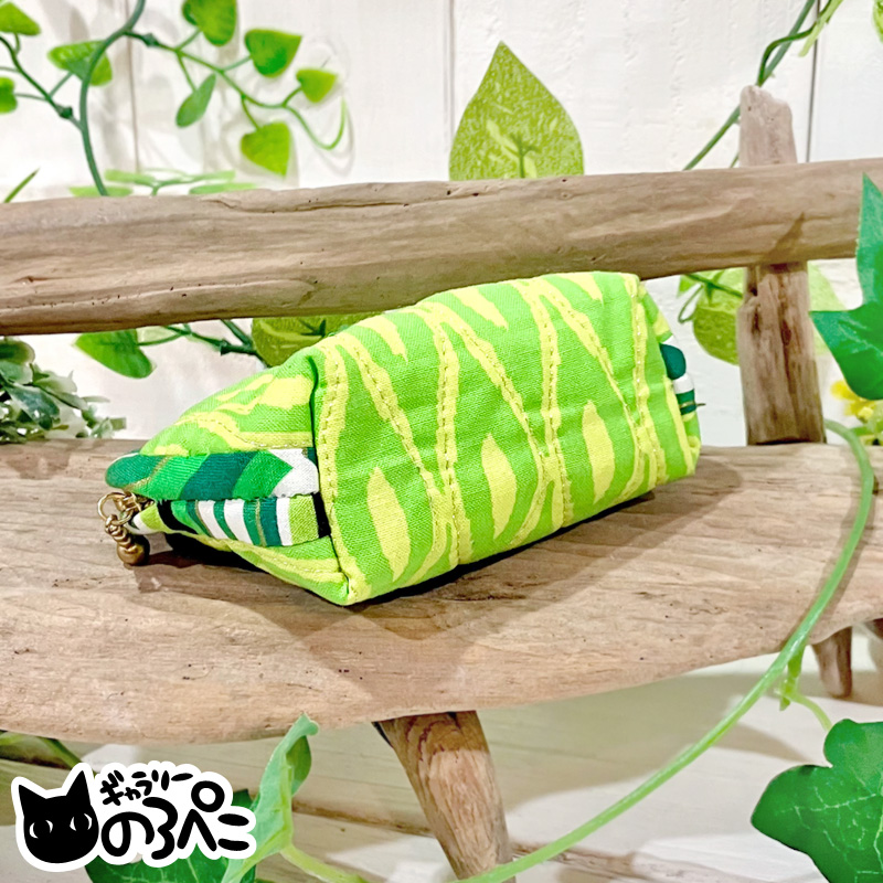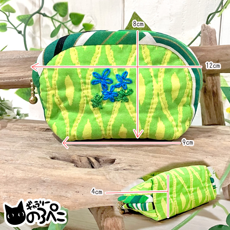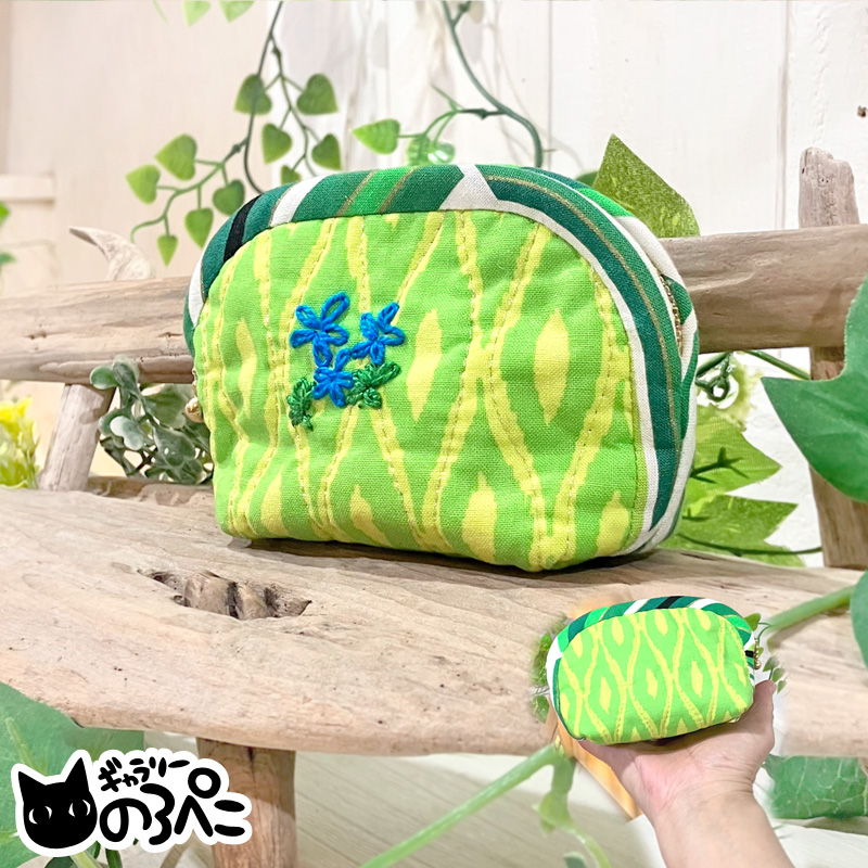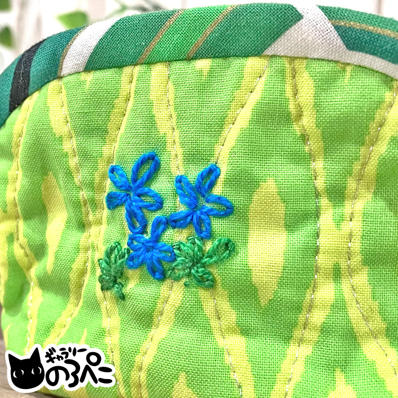外側は、葉っぱのような模様の黄緑色のコットン生地。模様にあわせて銀色のラメ糸でキルティングがしてあるので、光があたるとキラキラします。小さな花の刺繍がワンポイント。