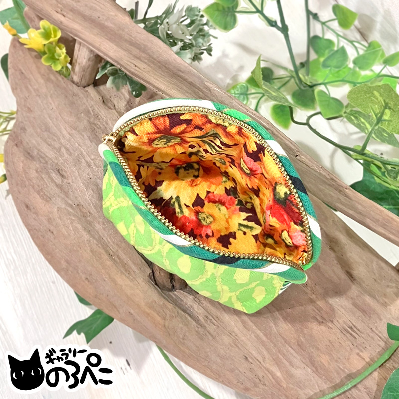 シンプルなデザインの外側に対して、内側はちょっと意外な感じのするリアルでちょっぴりレトロな色合いの花柄コットン生地。開いたとたん表情が鮮やかになる感じ。なんだか開け閉めのたびに楽しいデザインです。