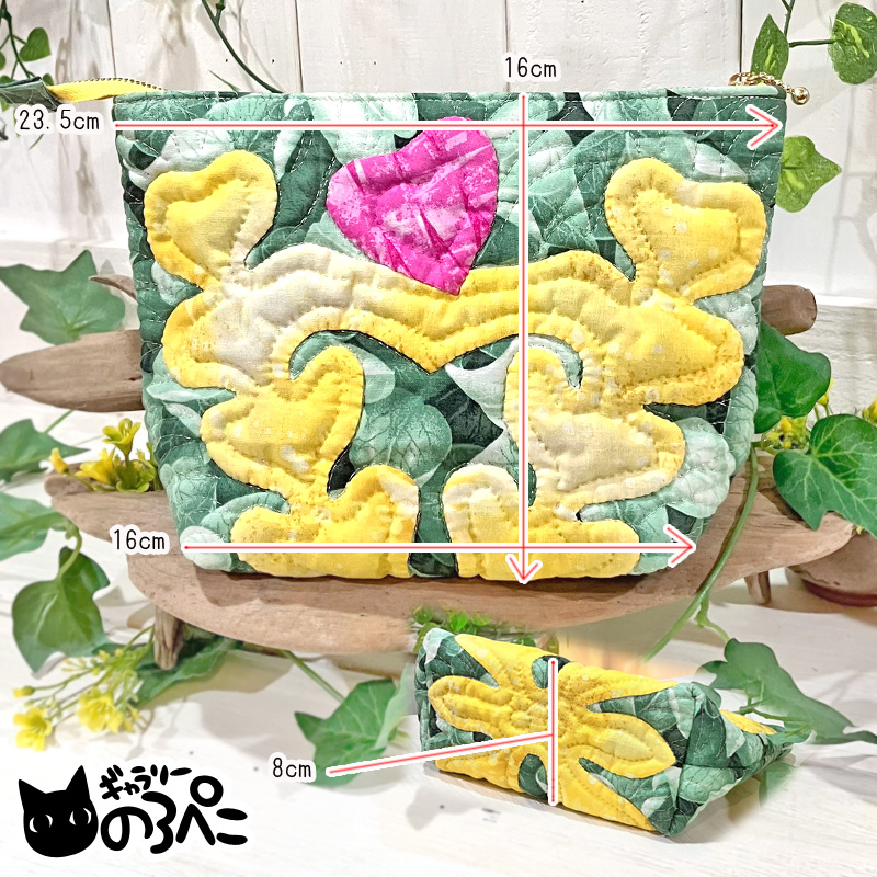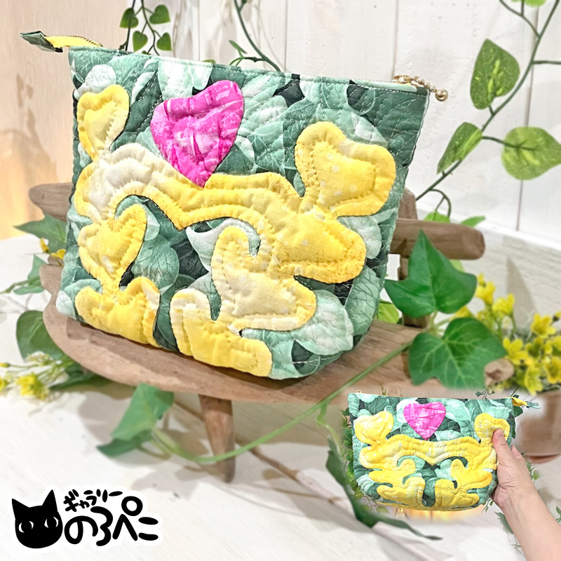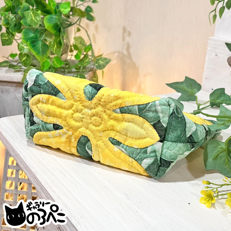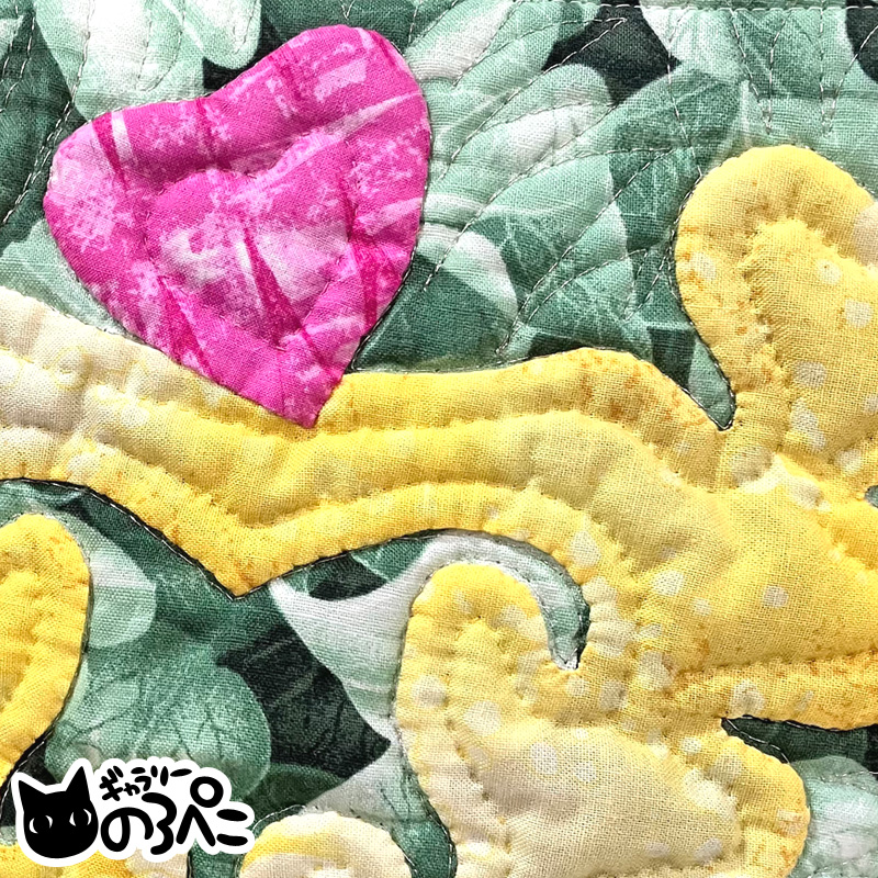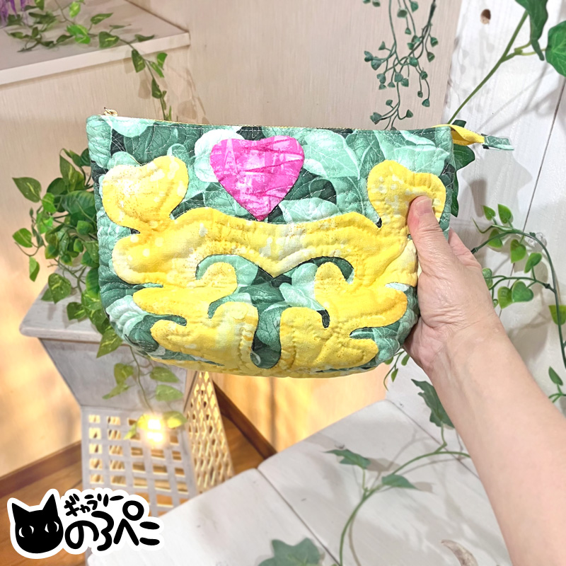 背景は緑の葉っぱ柄の生地。全体に銀色のラメ糸をつかったフリーモーションキルトで模様を描かれているので、光があたるとキラキラッとして、ポーチの中の世界にますます生命感が満ちて感じられます。