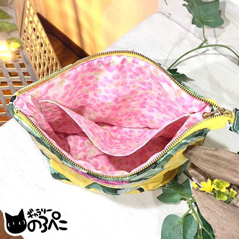 表側全体がキルトで、キルト綿も入っているので、程よい厚みがあってふかっとした手触り。適度な張りもあってしっかりしていて、中に入れたものを守ってくれるような安心感があります。口幅はゆったり約23.5cm。ファスナーエンドをポーチの外に出してあるので、入れ口がしっかり大きく開いて、中身の出し入れがしやすいです。