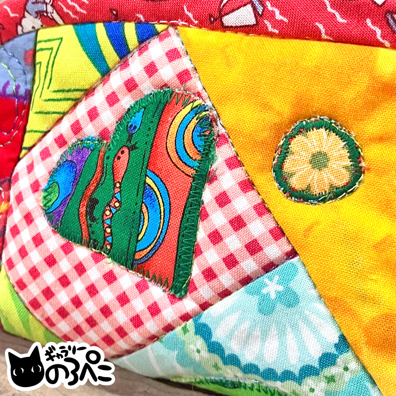 鮮やかな花柄の中にハートモチーフのパッチワークがおどって、まるで花が風に揺れる森の中にいるみたいです。よく見るとハートの中にヘビが顔を出してたりちょうちょがたくさん飛んでたり、じっくり見てると楽しくなってきちゃいます♪