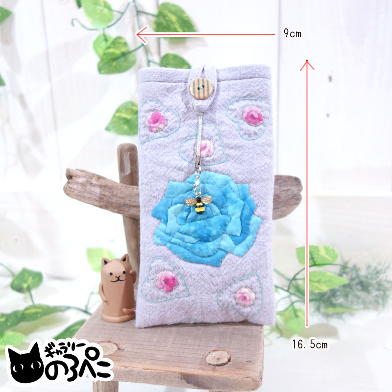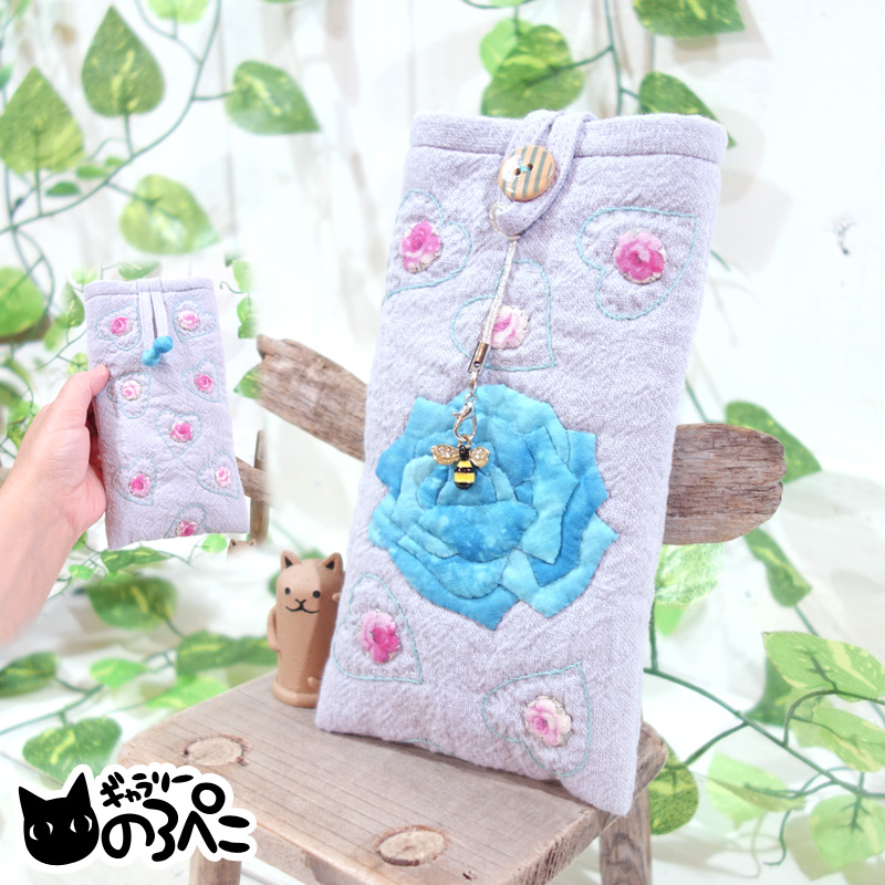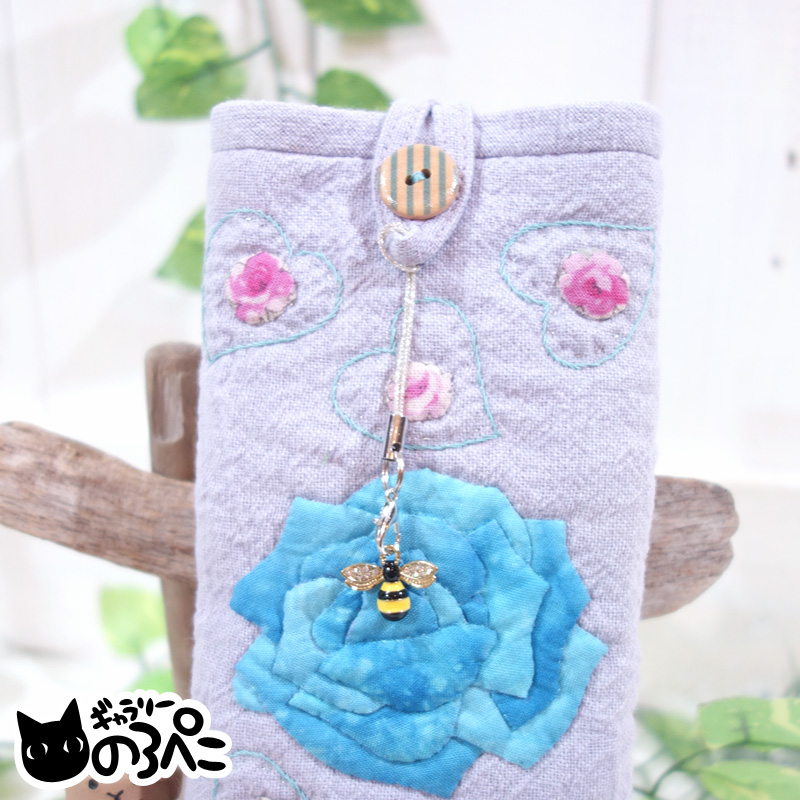 ポーチの入れ口はボタンにループをかけて閉じるようになっています。ループの後ろのひもの先端の青いポンポンもまるで薔薇のつぼみみたいでとても可愛らしいです。