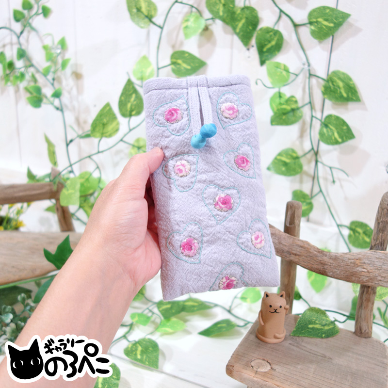 薔薇の花はアップリケで描き出されています。斑染め生地をつかい、花びら一枚一枚に少し立体感を持たせながら丁寧に表現されたバラの花は、表情豊かでとてもいきいきとしています。薔薇の花の輪郭やハートの内側にさりげなくラメ糸を使ってあるので、光があたるときらきらっときらめいて、まるで薔薇の花たちが陽ざしを浴びてよろこんでいるみたいです。