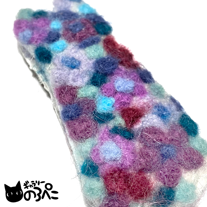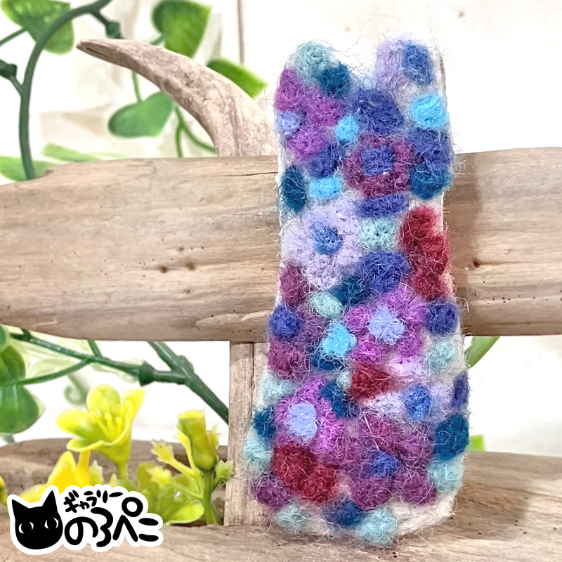 猫ちゃんは白い羊毛フェルトの本体に羊毛刺繍のような感じでたくさんのお花を咲かせてあります。土台部分は張りがあって、ヘロヘロしたりせずしっかりとしています。裏側は合皮で丈夫に仕上げてあります。