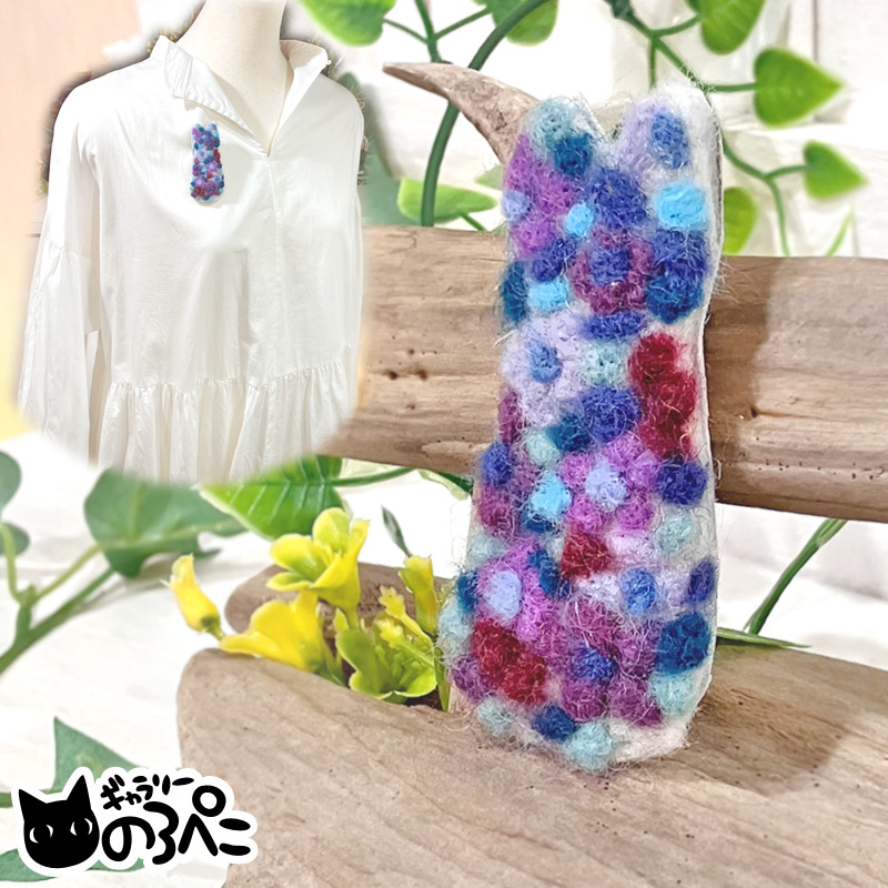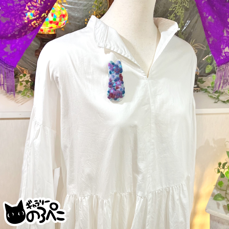 からだいっぱいにパープル系の花を咲かせました。軽いので帽子やストールなどにつけても邪魔にならないと思います。