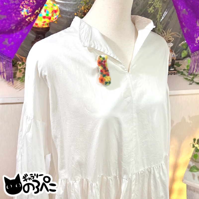 からだいっぱいに色とりどりの花を咲かせました。軽いので帽子やストールなどにつけても邪魔にならないと思います。