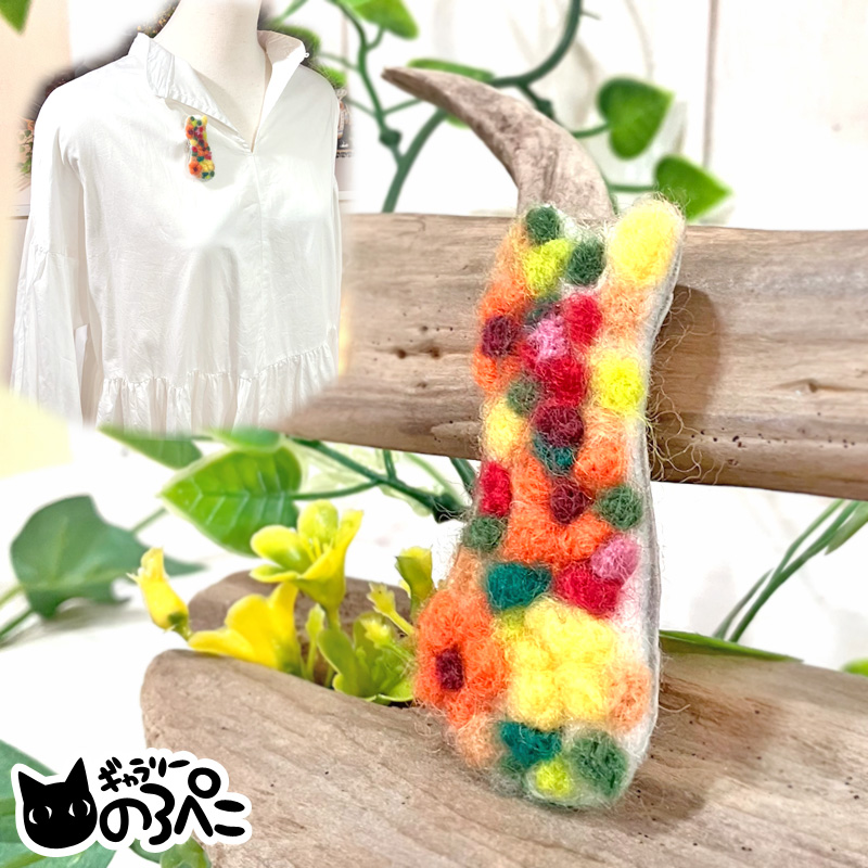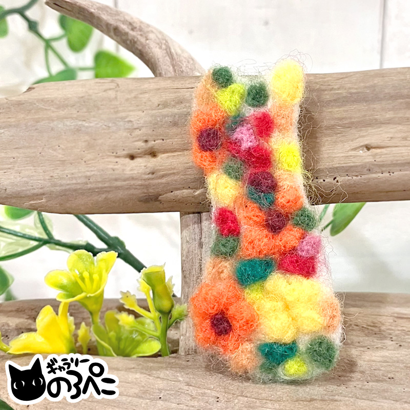 花に包まれた猫のブローチ(色鮮やかな花いっぱいの猫ちゃんの羊毛フェルトブローチ)