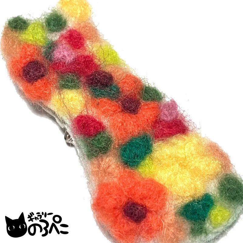 猫ちゃんは白い羊毛フェルトの本体に羊毛刺繍のような感じでたくさんのお花を咲かせてあります。土台部分は張りがあって、ヘロヘロしたりせずしっかりとしています。裏側は合皮で丈夫に仕上げてあります。