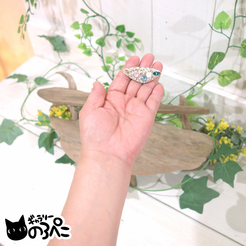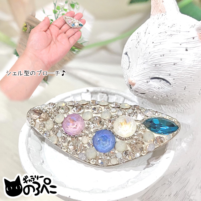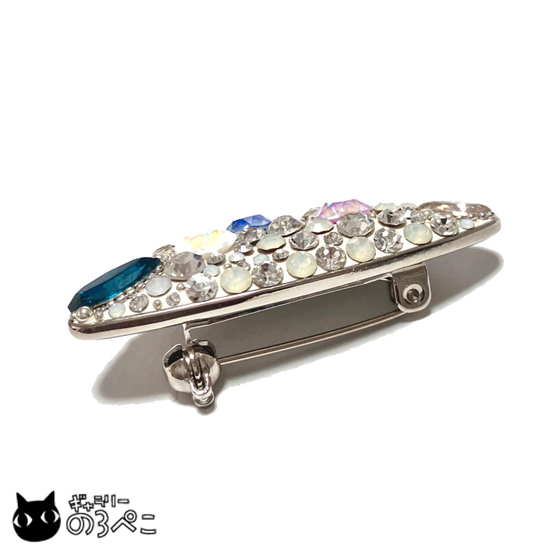 いろんな色や形のクリスタルをふんだんにデコレーションし、少しぷっくりとしたデザインに仕上げました。やや派手なデザインなので、無地のお洋服やストール、帽子などに付けていただくとブローチが引き立ち素敵なワンポイントになります。