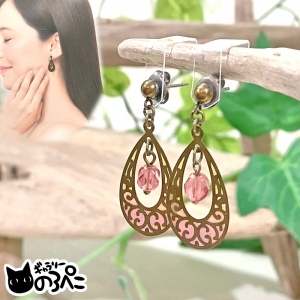 チェコビーズとステンドグラスみたいな透かしのピアス(オリエンタルなアンティーク風スタッドピアス・パープルピンク)
