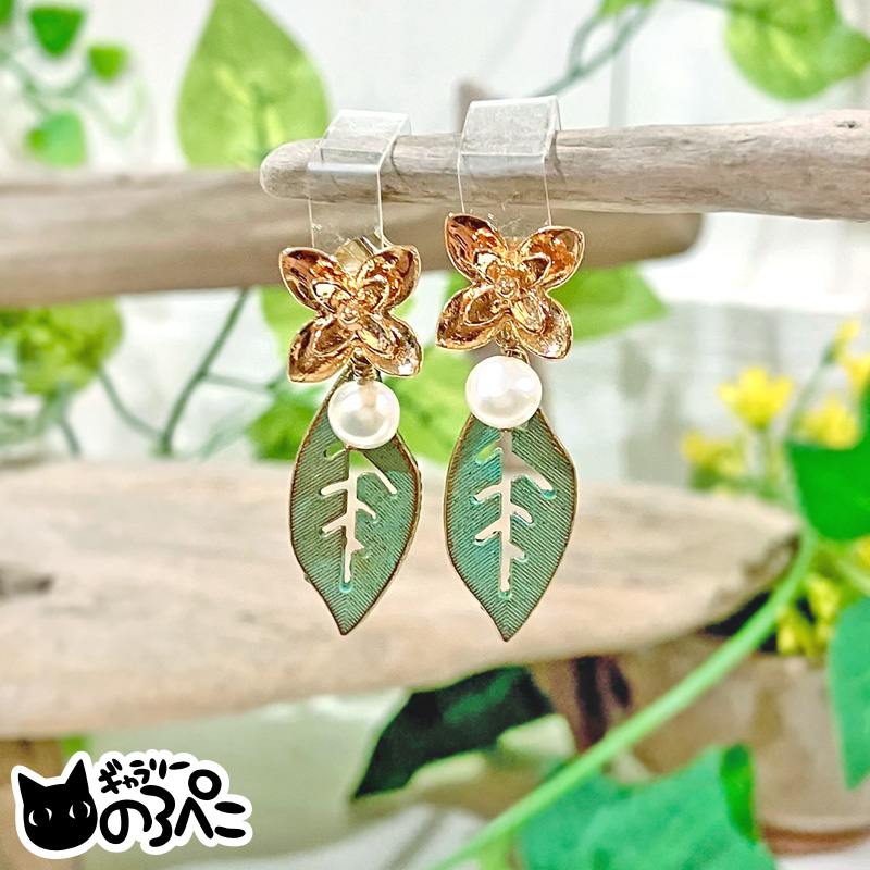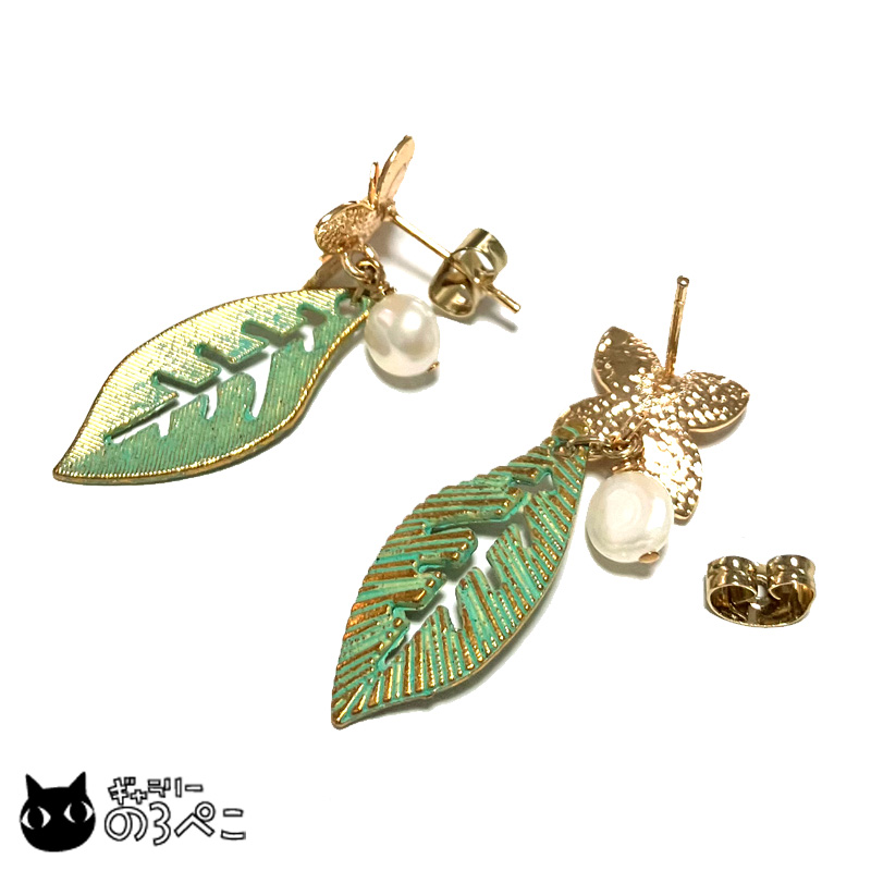 淡水パール、メタルパーツ(花・葉っぱ)、ピアスポスト、キャッチ