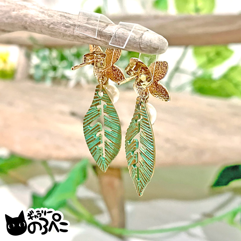 淡水パールが揺れる花のピアス(メタルフラワー&リーフと淡水パールのピアス)