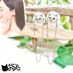 青い瞳の猫のチェーンフープピアス(シェルプレートから繊細なチェーンが揺れるステンレスピアス・シルバー)
