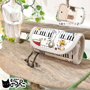 ピアノ猫ちゃんの4連キーケース(猫柄コットン&キルティング生地のボールチェーン付きキーケース・ホワイト)