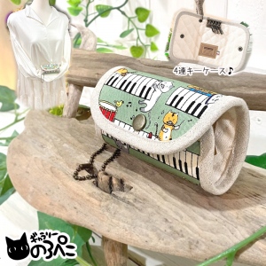 ピアノ猫ちゃんの4連キーケース(猫柄コットン&キルティング生地のボールチェーン付きキーケース・グリーン)