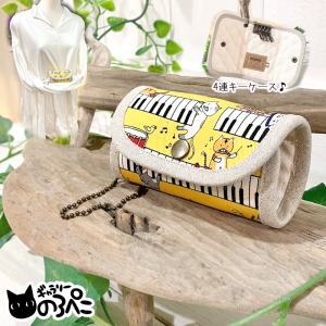 ピアノ猫ちゃんの4連キーケース(猫柄コットン&キルティング生地のボールチェーン付きキーケース・イエロー)