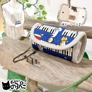 ピアノ猫ちゃんの4連キーケース(猫柄コットン&キルティング生地のボールチェーン付きキーケース・ブルー)