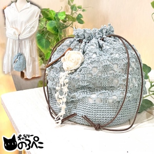 リネン糸で編んだ透かし編みの巾着袋(白いバラとレザータグのチャームを飾った手編みニット巾着ポーチ・水色)