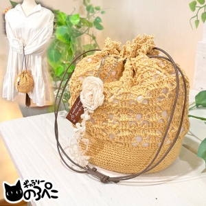 リネン糸で編んだ透かし編みの巾着袋(白いバラとレザータグのチャームを飾った手編みニット巾着ポーチ・橙黄色)