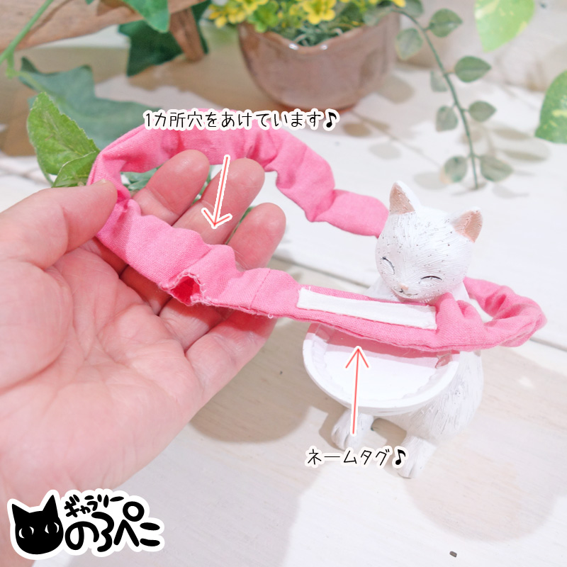 首輪はぐるりと一周約42cmで、中に平ゴムを長めに(約36cm)セットしています。猫ちゃんにも小型のわんちゃんにもお使いいただけます。