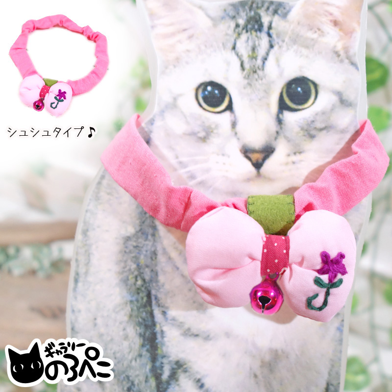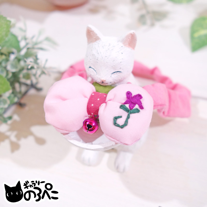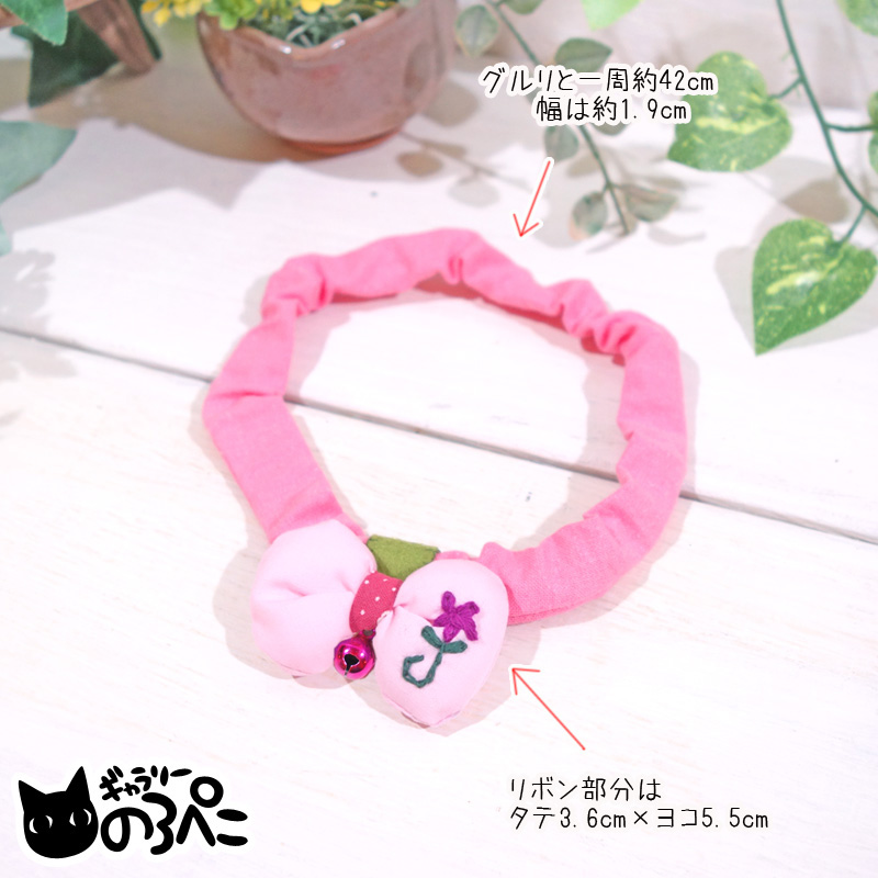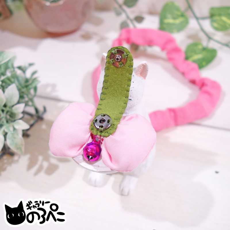 首輪は明るいピンク色のコットン生地。薄ピンク色のコットン生地でつくったぷっくりリボンをセットしました。リボンには小さなお花の刺繍をいれて、小さなピンク色の鈴をつけています。