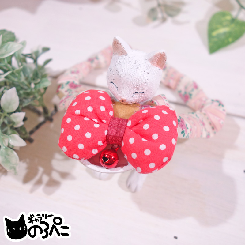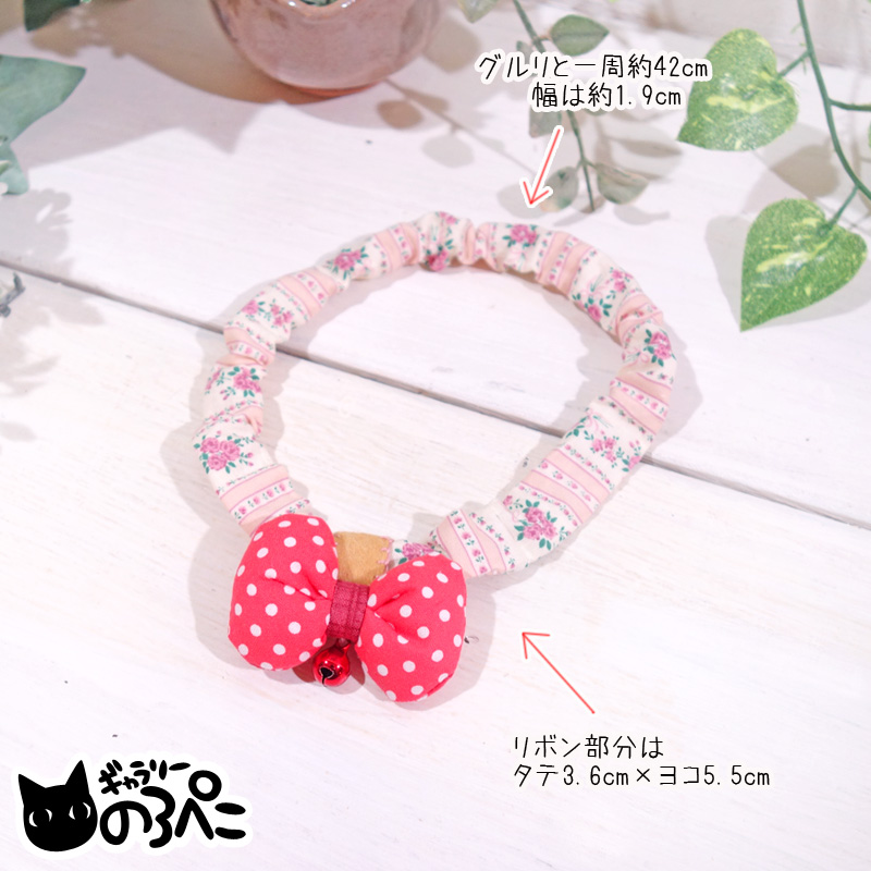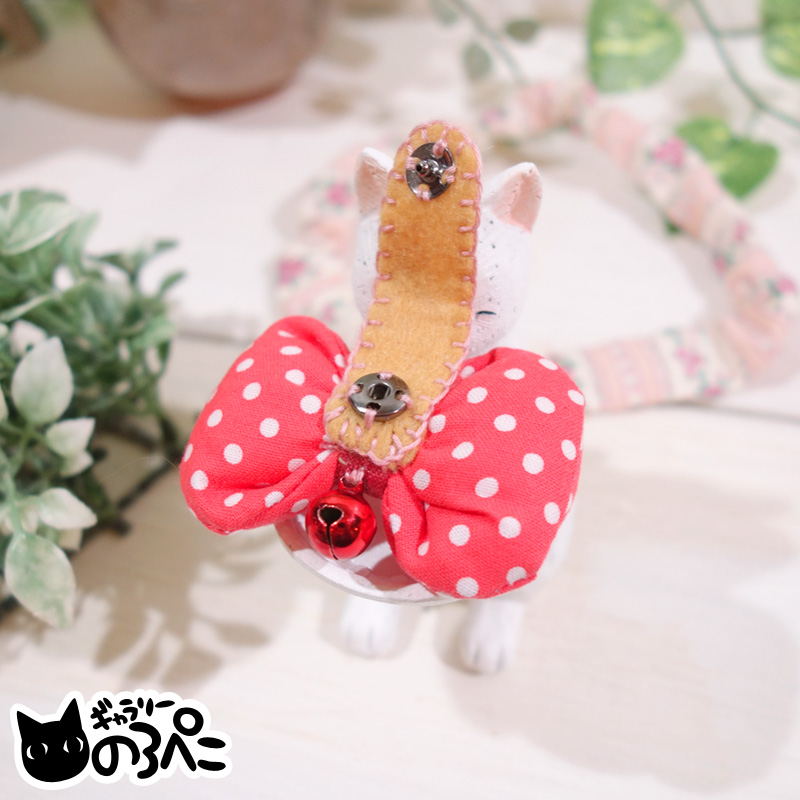 首輪はやさしいピンク色の花柄コットン生地。褪せた赤色に白ドット柄のコットン生地でつくったぷっくりリボンをセットしました。リボンには小さな赤色の鈴をつけています。