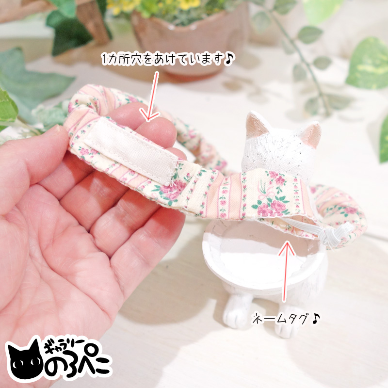 首輪はぐるりと一周約42cmで、中に平ゴムを長めに(約36cm)セットしています。猫ちゃんにも小型のわんちゃんにもお使いいただけます。