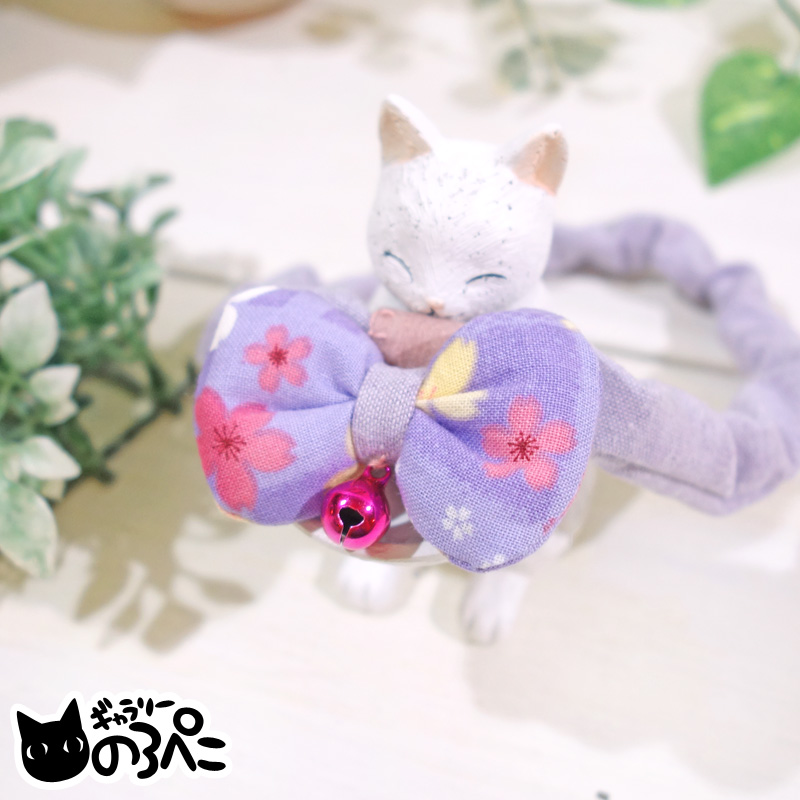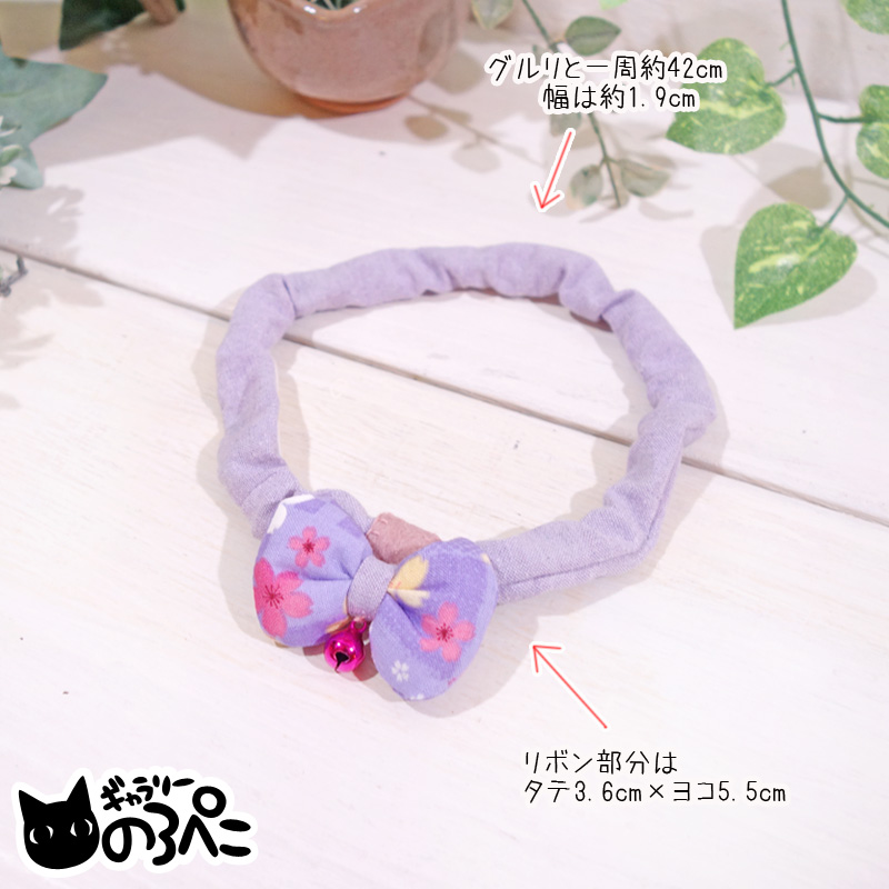 首輪は自然な風合いのラベンダー色コットン生地。和柄花柄の薄紫色コットン生地でつくったぷっくりリボンをセットしました。リボンには小さなピンク色の鈴をつけています。
