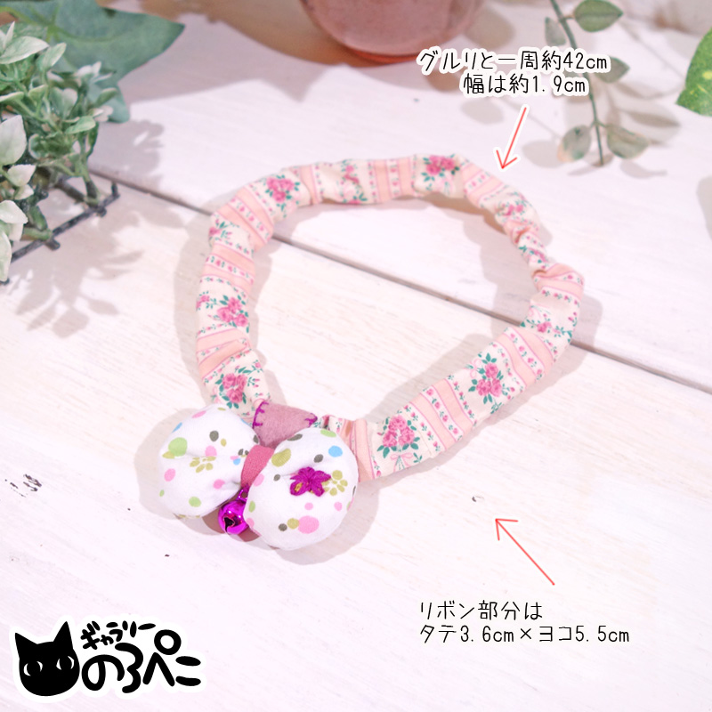 首輪はぐるりと一周約42cmで、中に平ゴムを長めに(約36cm)セットしています。猫ちゃんにも小型のわんちゃんにもお使いいただけます。
